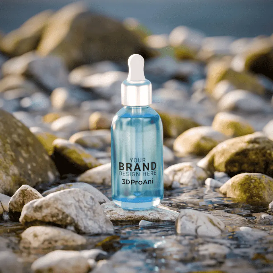 Bring your cosmetic or skincare branding to life with this high-quality 3D dropper bottle scene, set in a tranquil and photorealistic rocky water environment. Perfect for showcasing serums, oils, or any wellness product, this scene is fully set up for easy product placement and fast rendering.