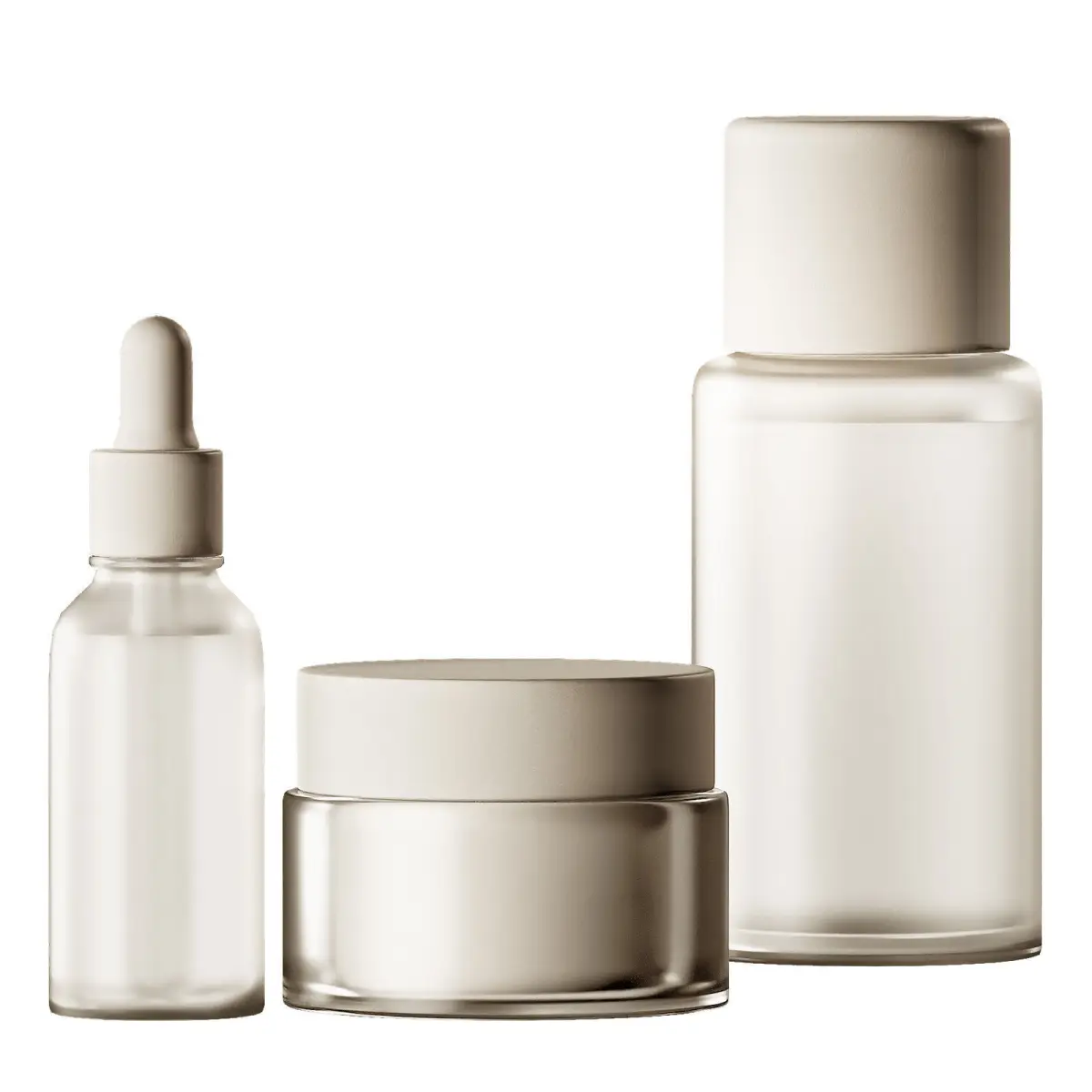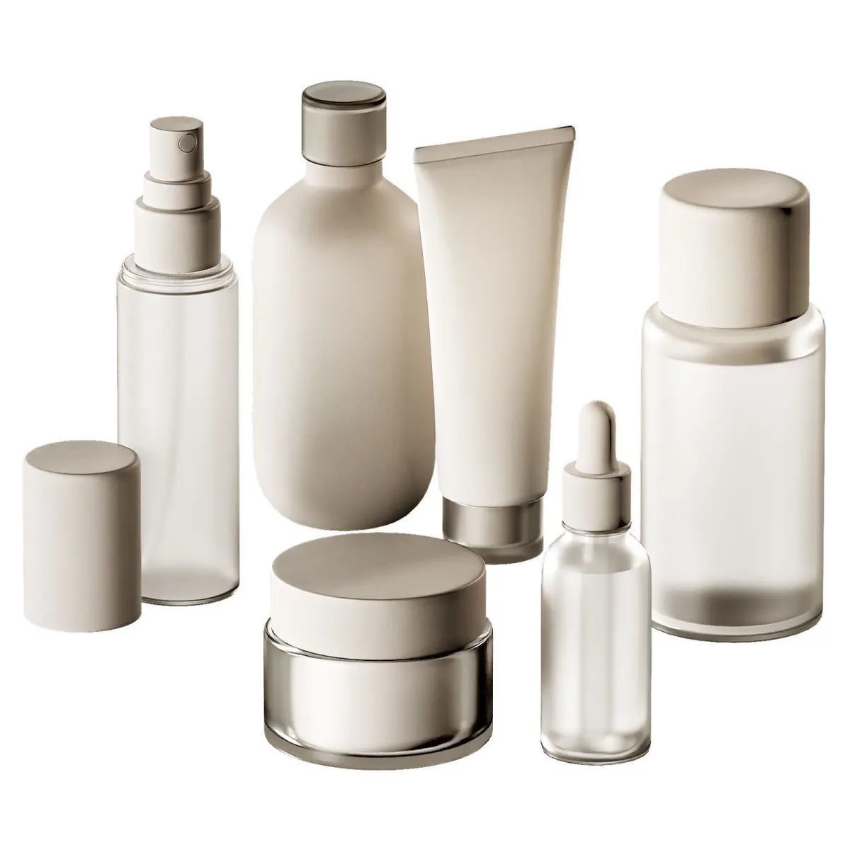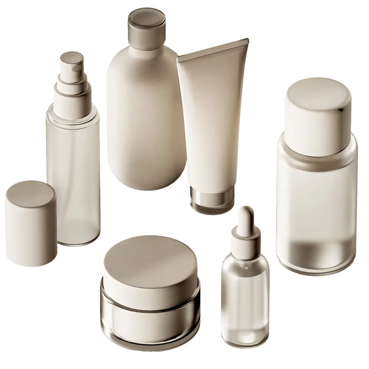 The 3D model contains a decorative set of items for cosmetics. Simple minimalist containers, jars, bottles, tube for cosmetics. 3D mockup layouts for advertising branded cosmetic products.