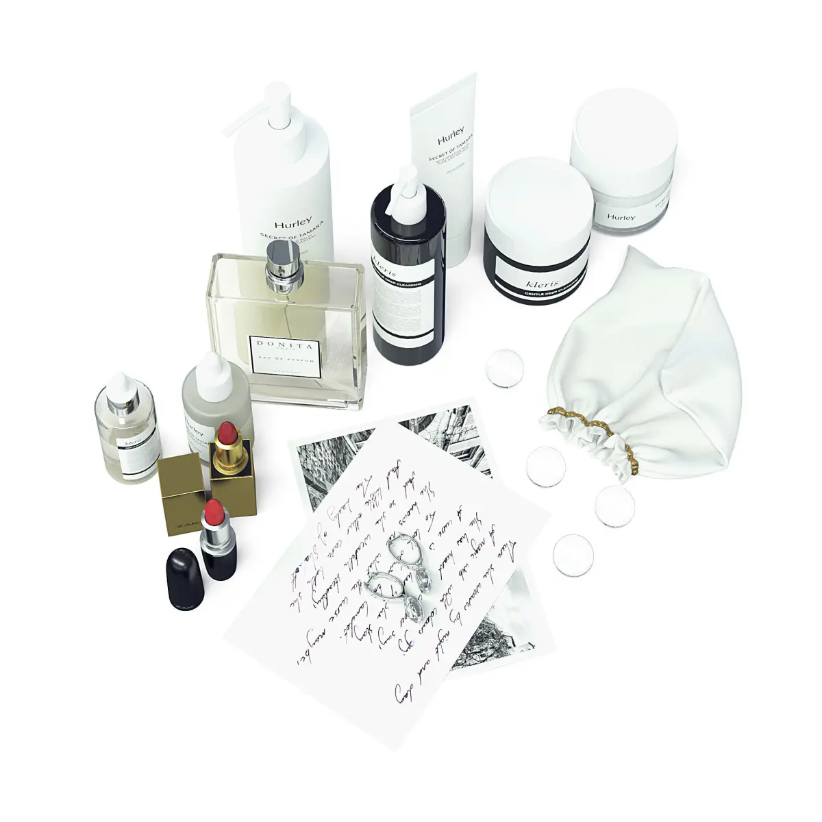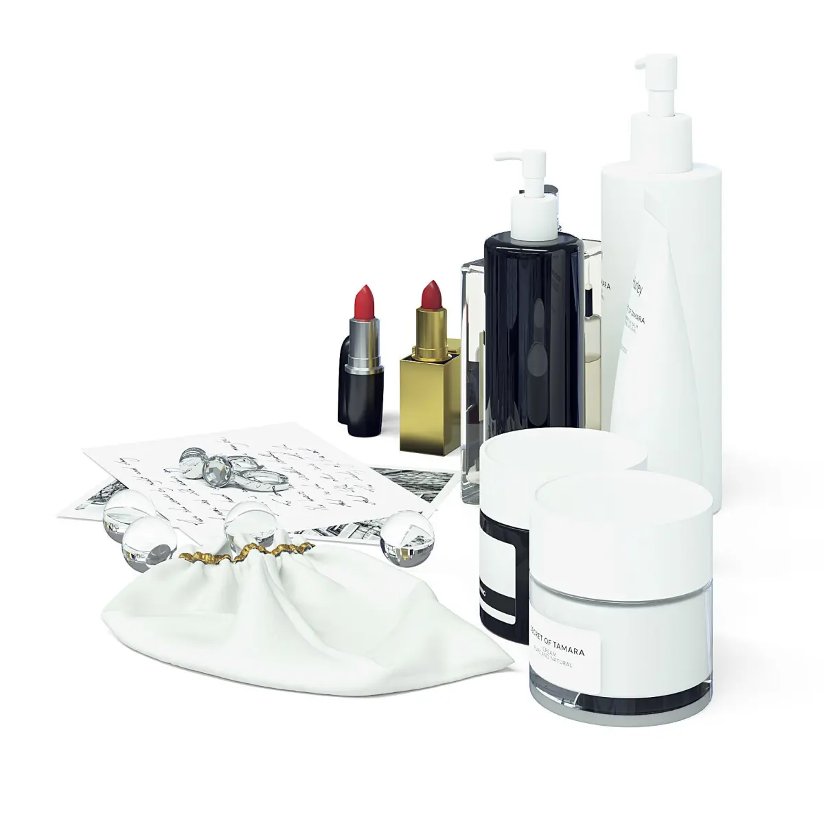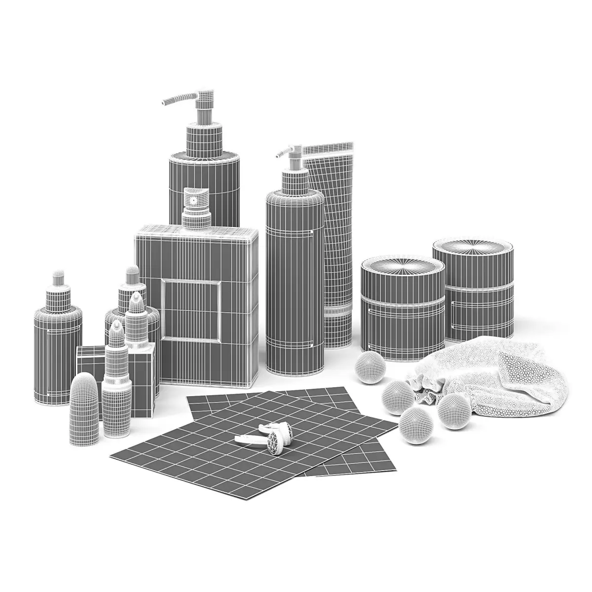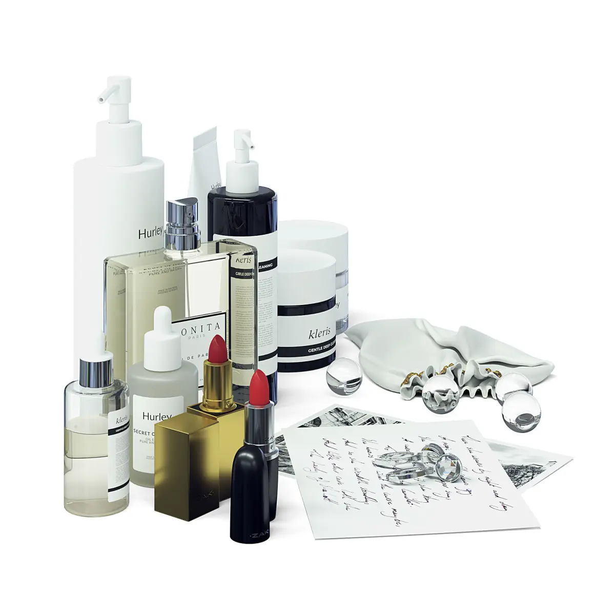 Cosmetics Set 3d model with perfumes, creams, cleaners and soaps.