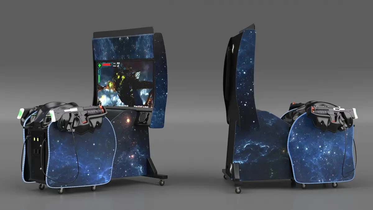 Entertainment type, space battle style (science fiction or sci-fi style) video game equipment (device, tool, apparatus or machine) which uses realistic light guns, players aim items and shoot at on-screen enemies (invaders), defending Earth planet from imaginary evil alien hordes. The entertainment type and well known (science fiction or sci-fi style) video game apparatus (machine) which features special interactive environments, and competitive player options, creating an sci-fi style exciting gaming experience and fun. The popular and widespread, science fiction environment emulation, electronic Arcade game which is playing toy cabinet or accessory (apparatus, device, tool or equipment).