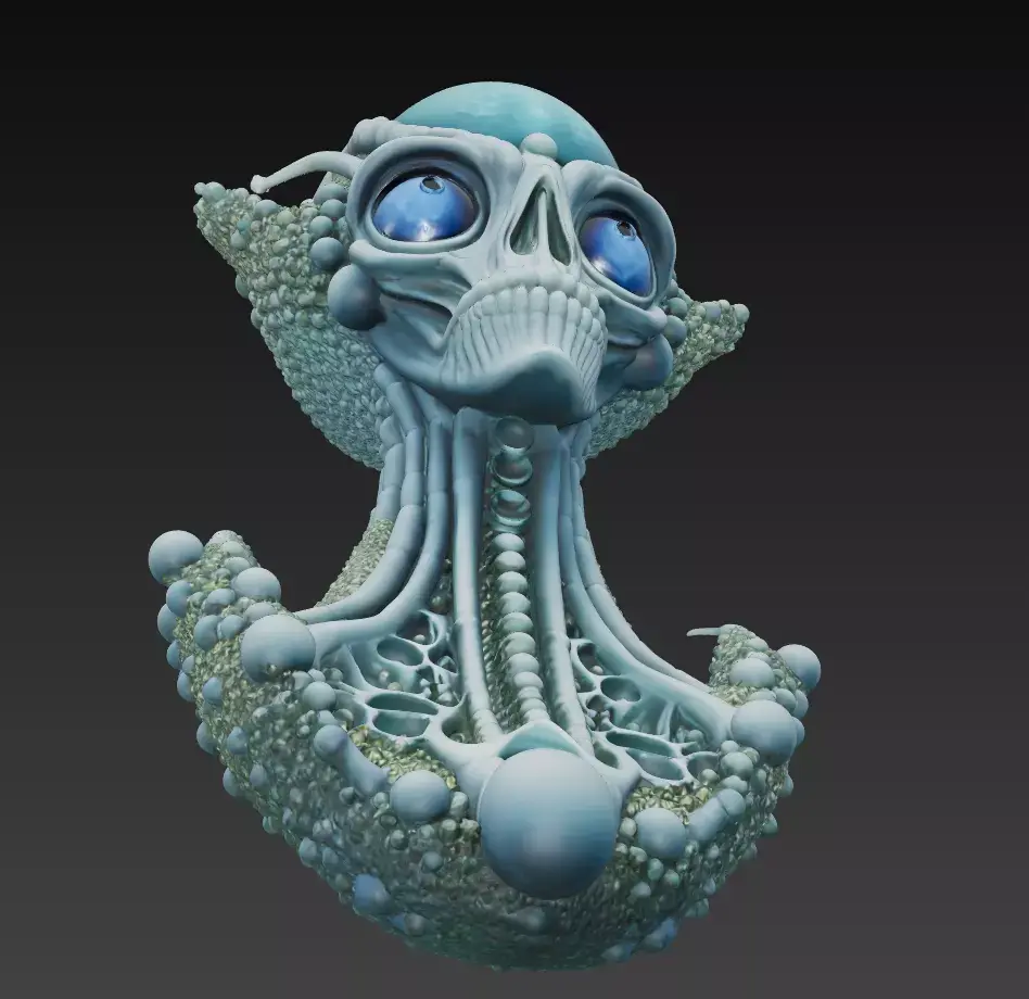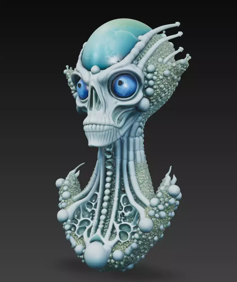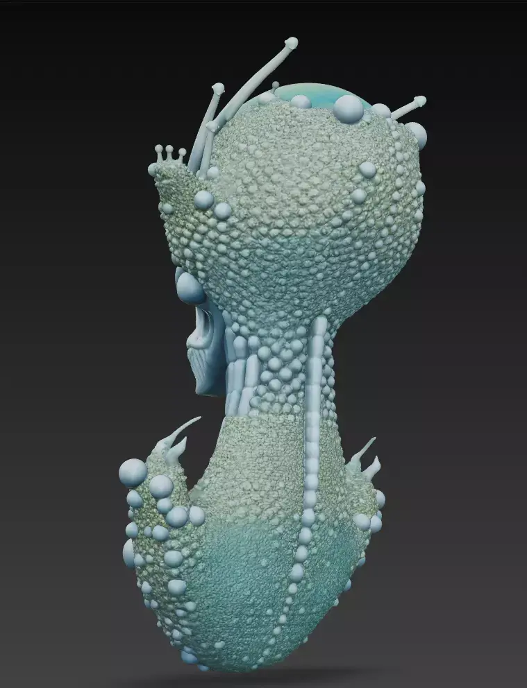 The flowing lower anatomy of the bust is filled with interconnected bone-like forms, spherical growths, and alien cellular patterns—creating a unique blend of Giger-inspired surrealism, cosmic fantasy, and biological abstraction.Perfect for 3D printing, CGI scenes, creature design inspiration, collectibles, concept art, and dark sci-fi environments.