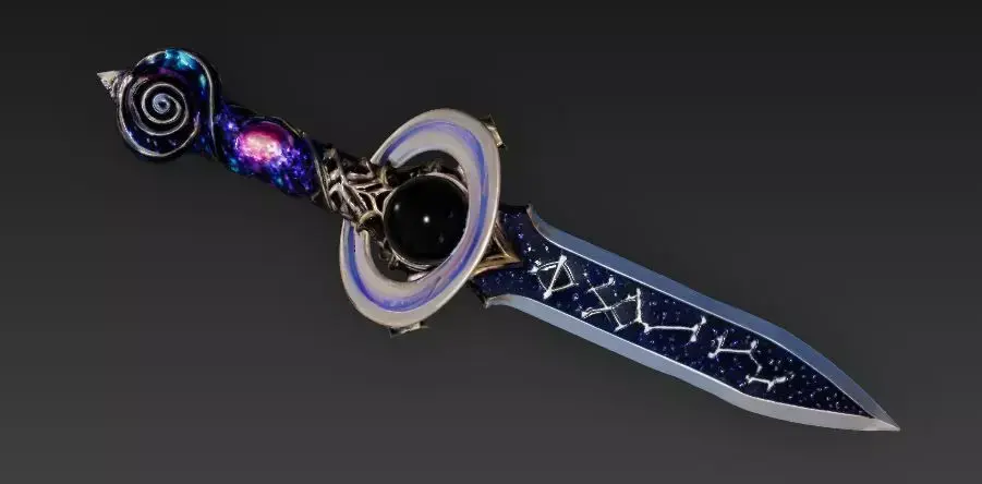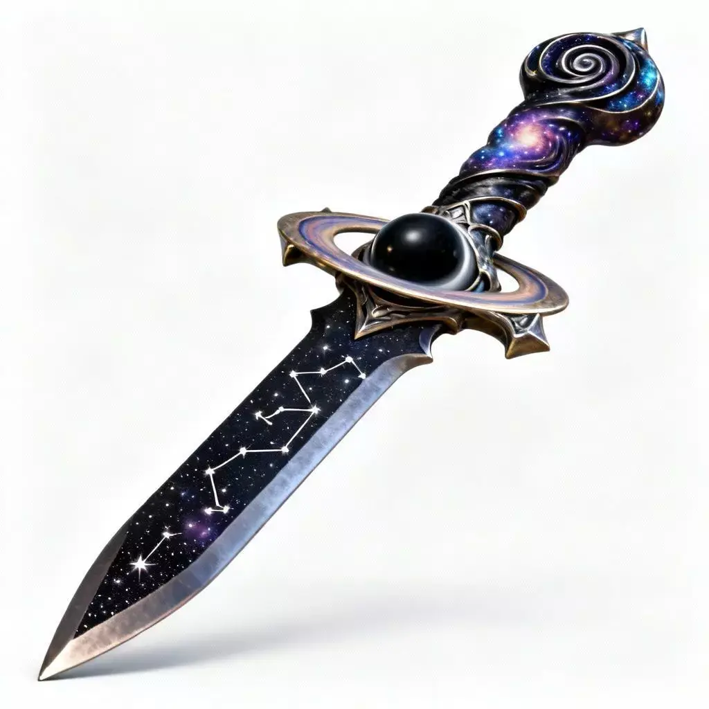 Constellation Blade The blade isn't made of steel. It is a solid shard of the night sky, deep black and filled with distant stars. Connecting these stars are glowing white lines forming a constellation, suggesting the dagger guides the user or aligns with fate.