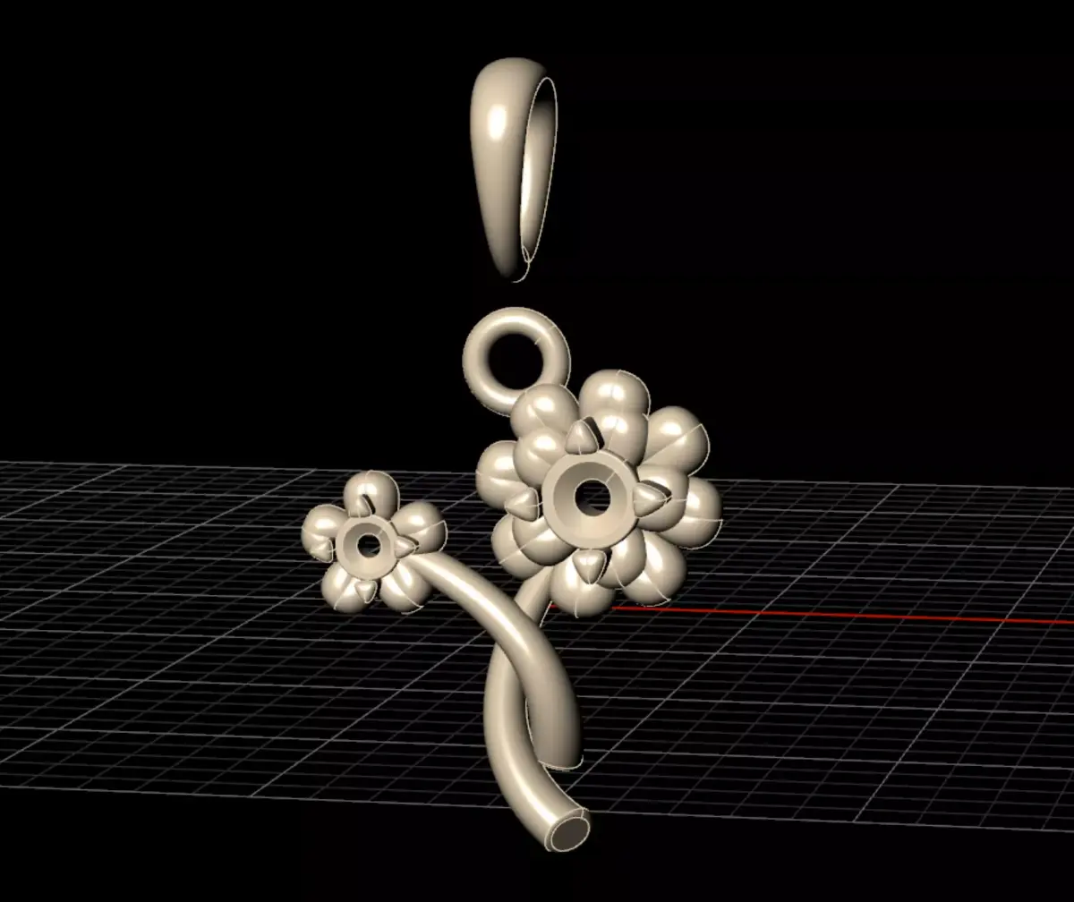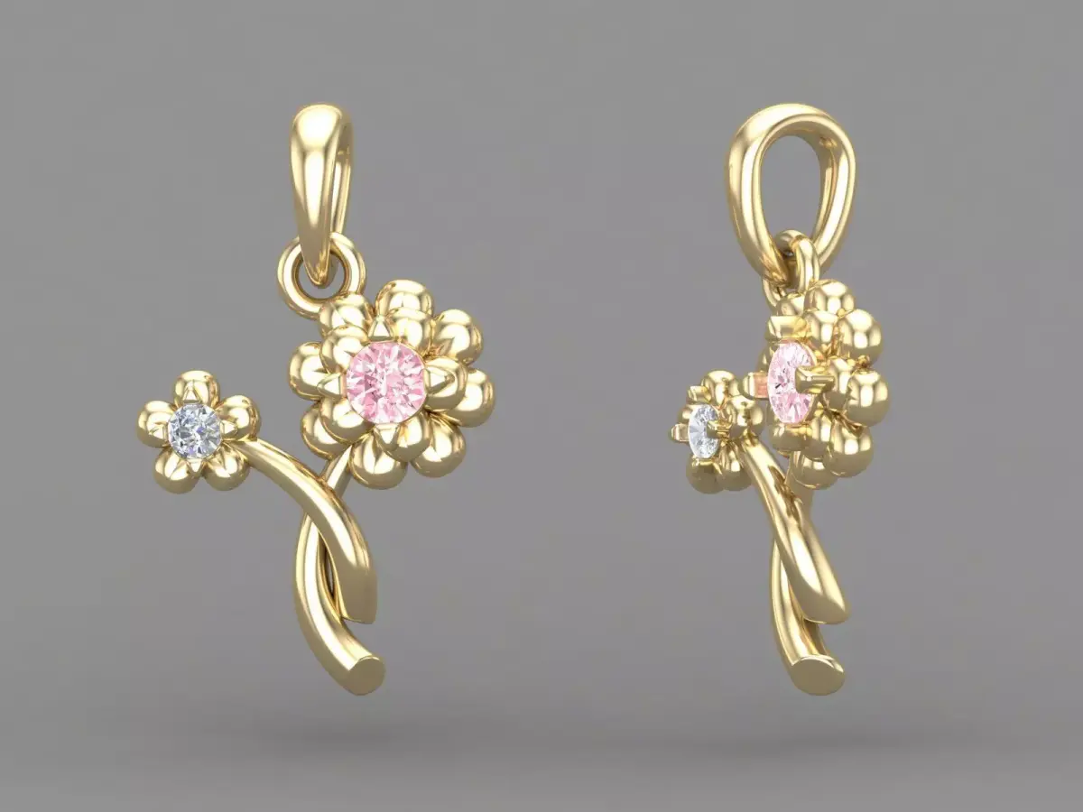 This stunning 3D CAD design showcases a delicate floral-inspired jewelry piece, perfect for creating a pendant or charm. The design features two intricately crafted flowers, one larger with a radiant pink gemstone at its center and the other smaller adorned with a brilliant white gemstone. The flowers are connected by a graceful curved stem, giving the piece a natural and harmonious aesthetic.