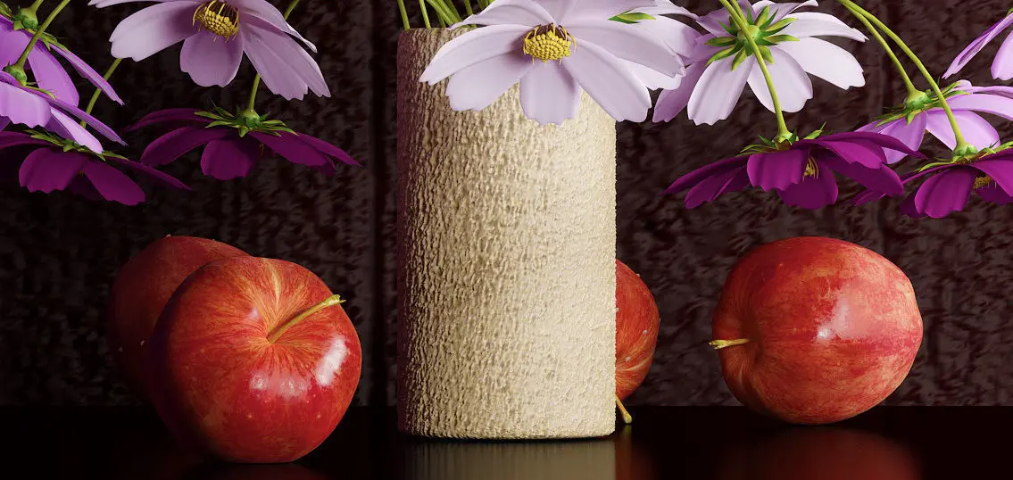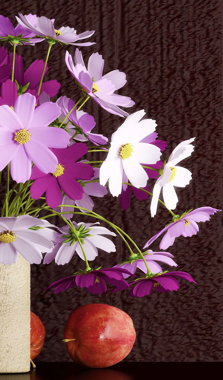 A flower vase decorated in cosmos flowers of different colored in the vase with a healthy apples goes perfect on table top, no texture used for flowers direct material applied, designed completely in 3dsmax