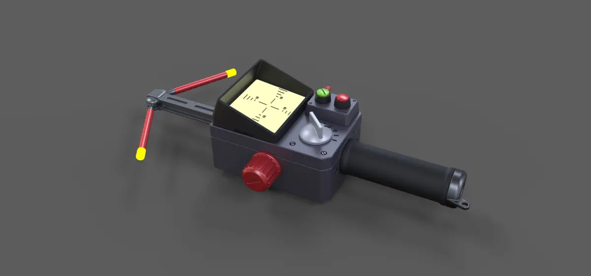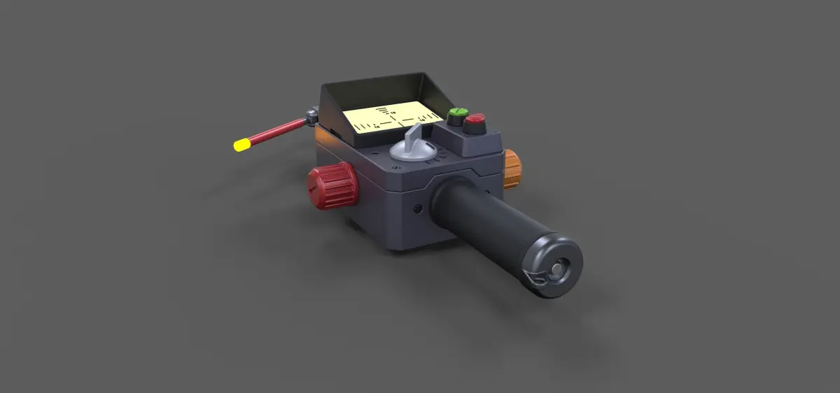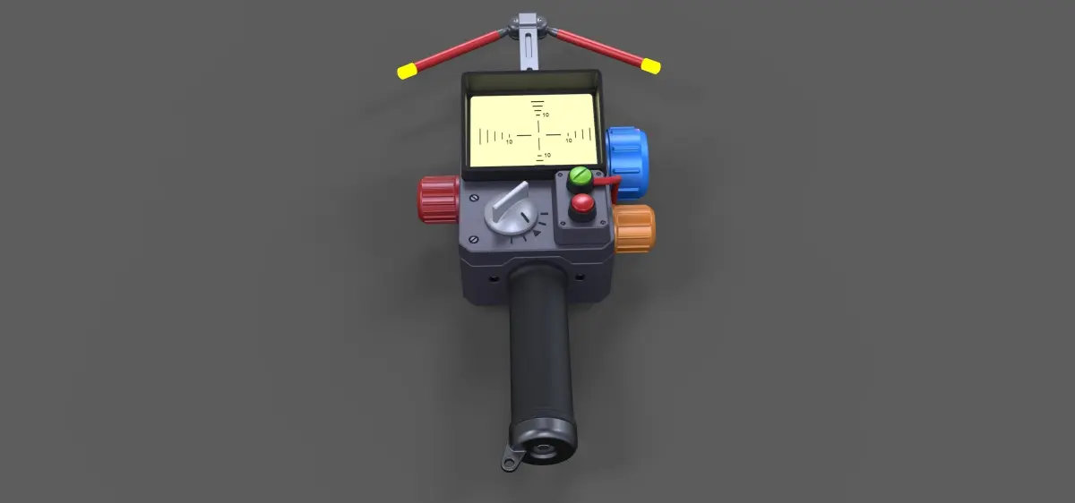 Model consists of parts: bar, blue regulator, body, bottom insert, green button, handle cap, handle, indikators, orange regulator, pins, red button, red regulator, screen body, screen, top insert, top regulator, wire.
