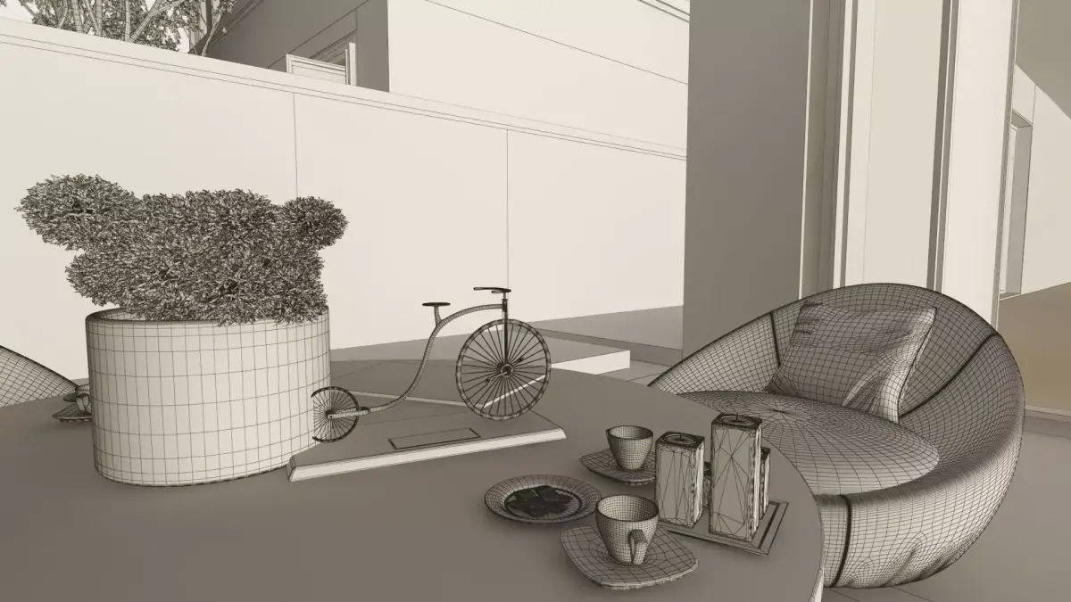 Cottage/villa concept with interior and patio. Trees are vrmesh (3 files).
