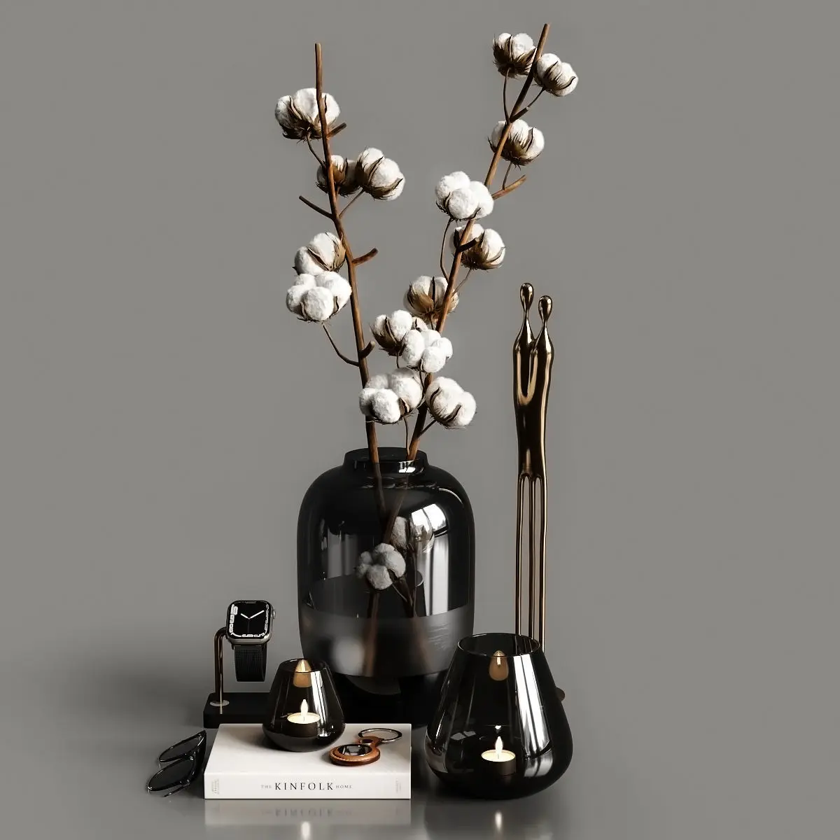 Decorative composition with cotton branches and candles