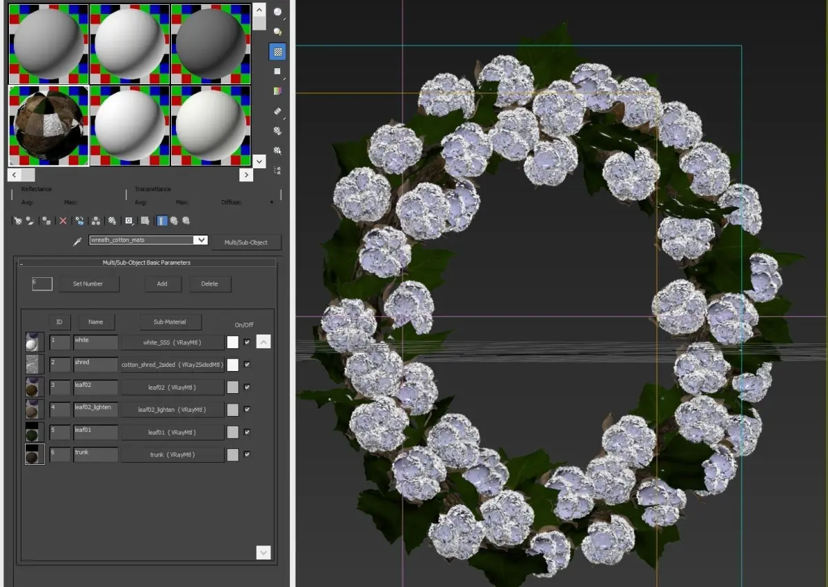 MAX 2013, 2016FBX 2011, OBJRound wreath of cotton flowers and green leaves.faces: 627,816Flowers and leaves are made by instances and grouped.diameter ~ 70 centimetersVray 3 and above, Corona 1.6 and above