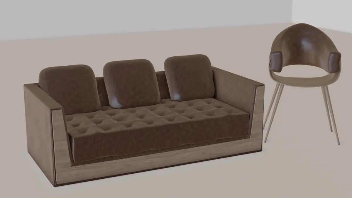This model contains ONLY couch and 3 pillows. (Chair was included only for render).You can find 3 materials (leather wight/brown and fabric)(in archive).UV mapping.There is couch, camera and light in basic Blender scene.Can be used for interior scenes.