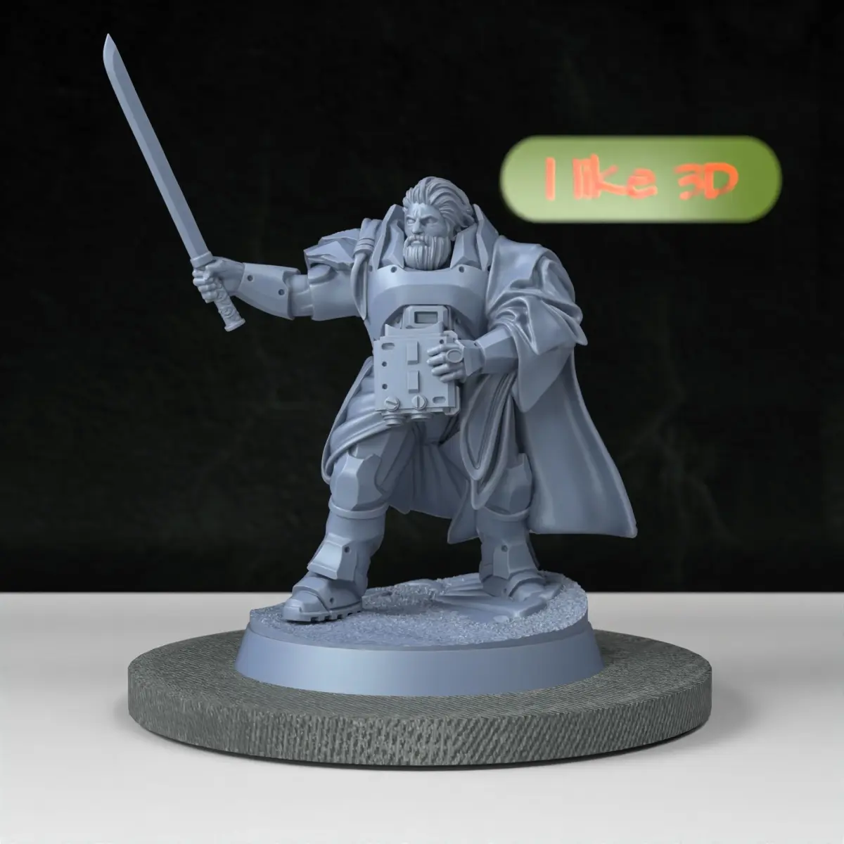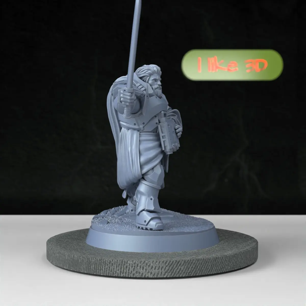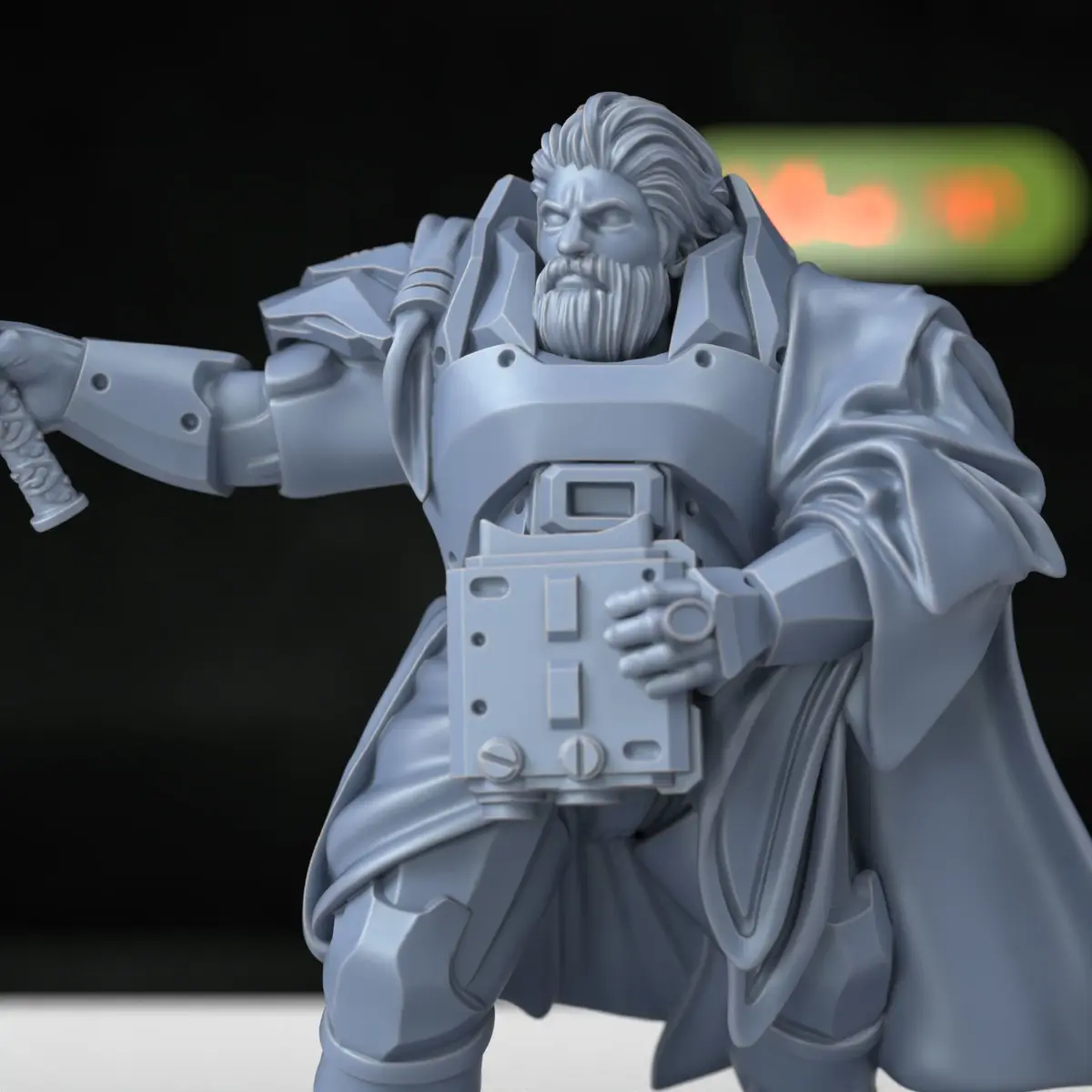 Count Shannon Miniature, a captivating portrayal from the Arrakis, Dune, Dune 2 Universe. This intricately crafted figurine showcases Count Shannon in full sci-fi armor, wielding a sword in his right hand and advanced binoculars with thermal and range capabilities in his left. With long hair, a flowing beard, and a regal cape, Count Shannon exudes authority and strength.
