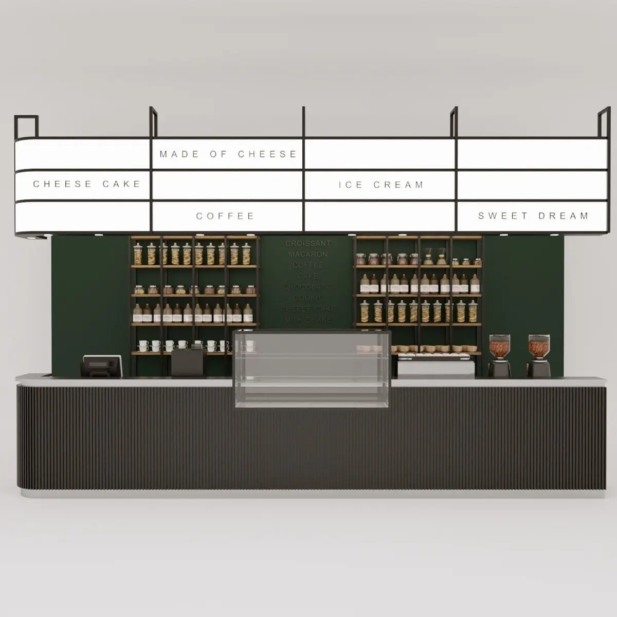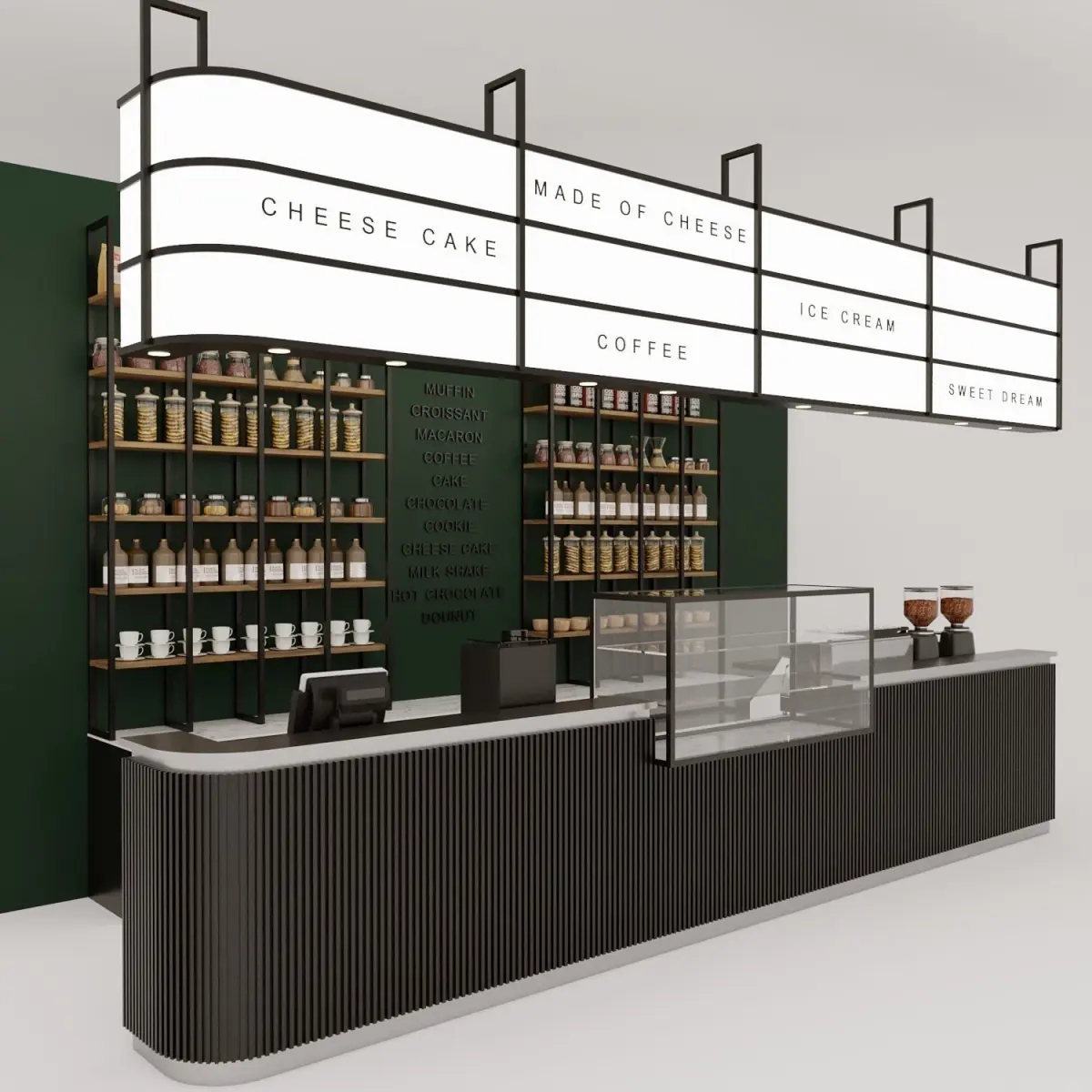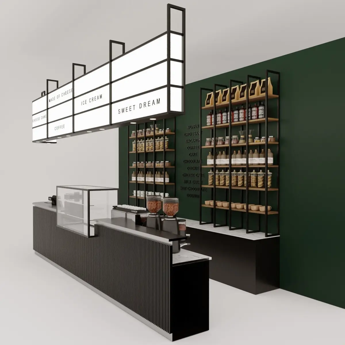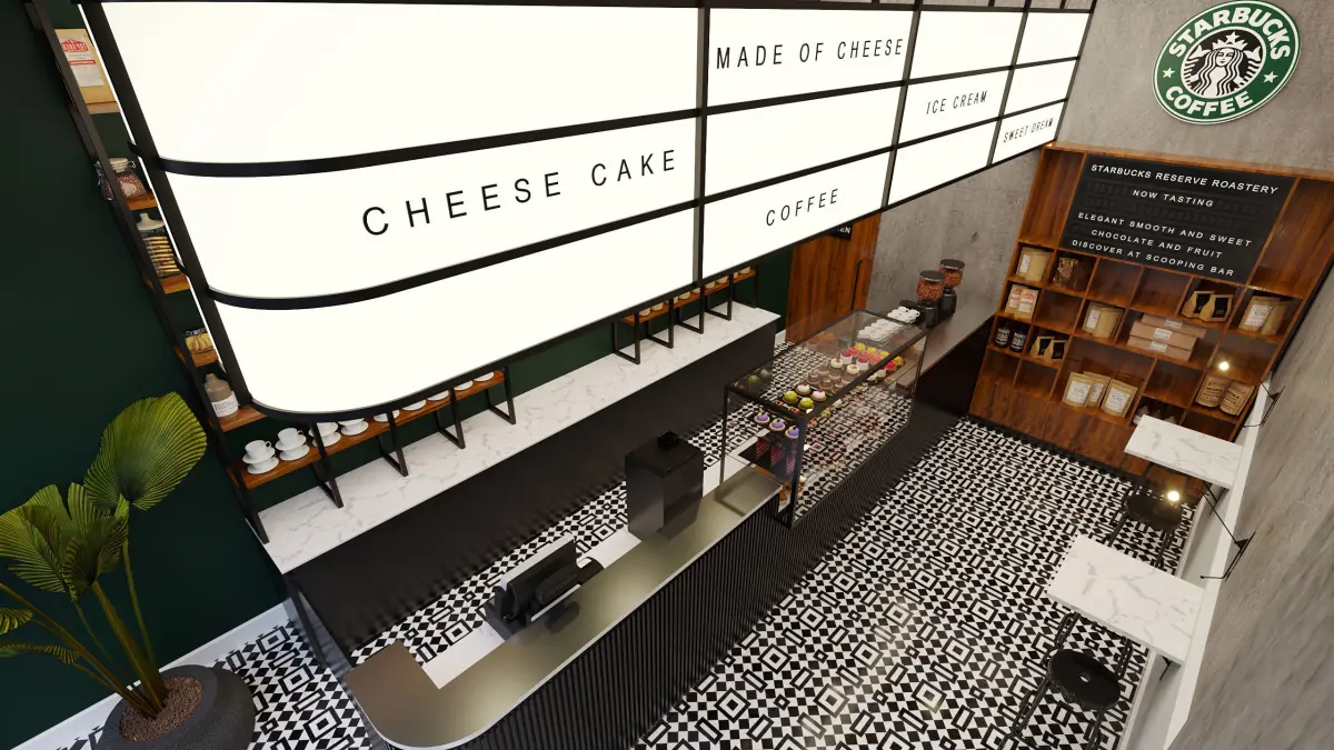 The 3D models of the counter and cake showcase and the café shelf with Starbucks-specific design are visual design elements used in cafes and restaurants to create an appealing and efficient visual experience. These designs are primarily used in Starbucks, one of the largest coffee chains worldwide.