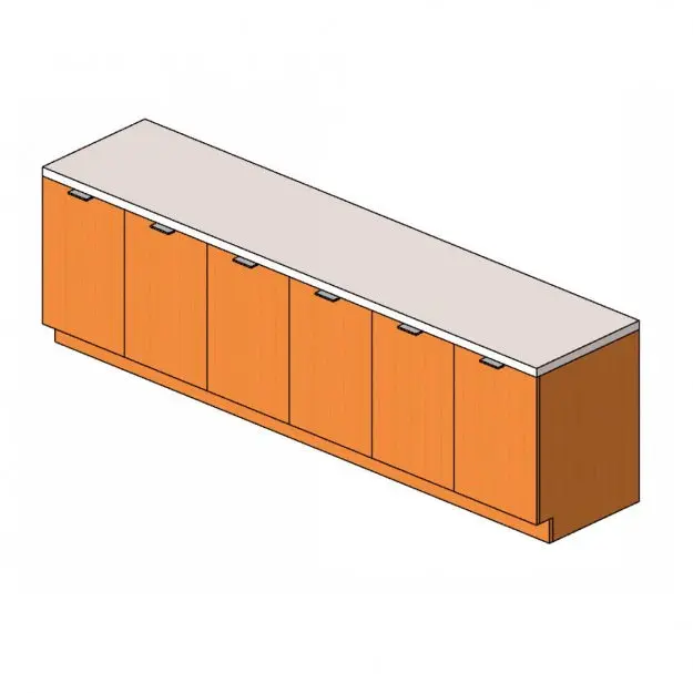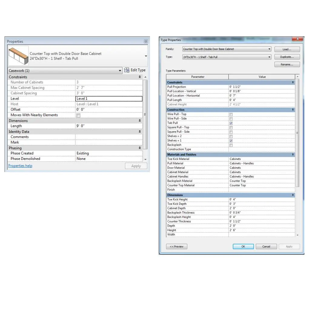 Countertop with Double Door Base Cabinet. This is a Revity Family created by an interior designer for interior designers and architects. It is simple and adaptable. It is an array family, so that you can make the countertop any length you want and the base cabinets will adapt. Backsplash can be turned on/off. 3 handle types come preloaded. See images for full list of parameters.