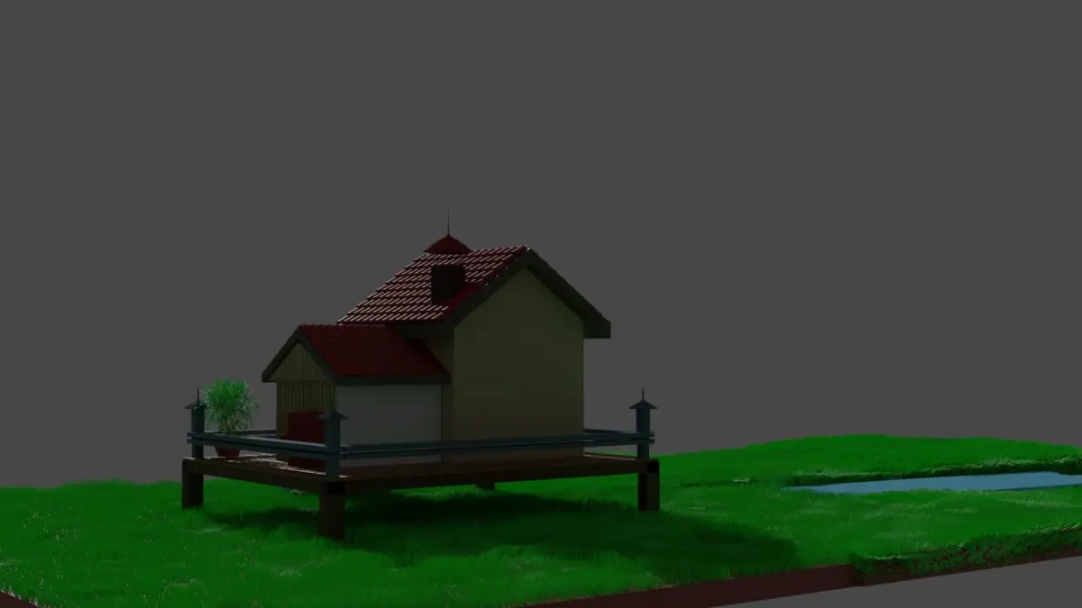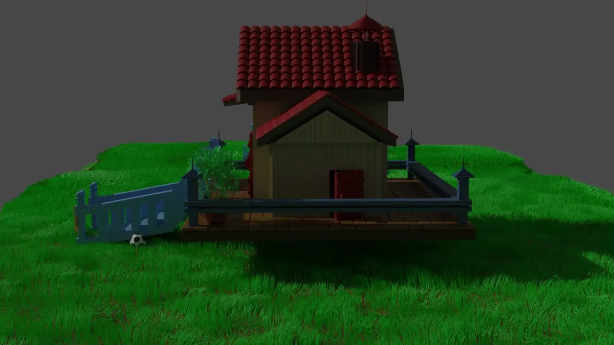 A country house surrounded by a grassy environment and a small river extending in the distance to that house, with a small staircase going down to the grassy area, a football and a bush in front of the door of the house
