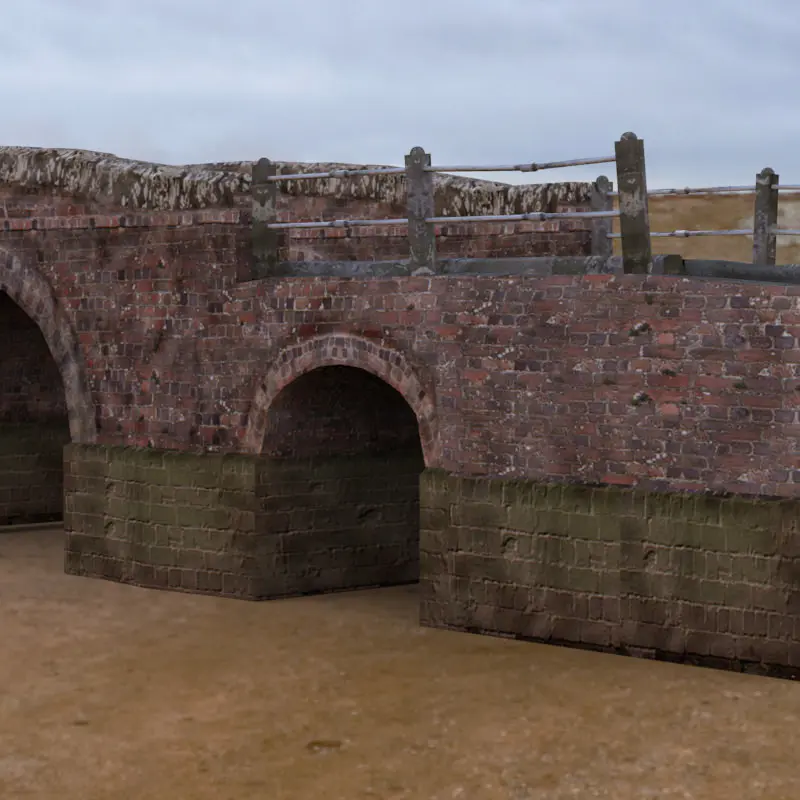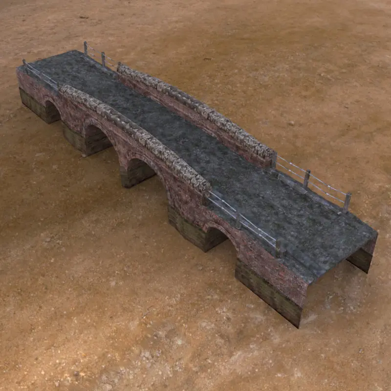 A bridge for a single track country lane to cross a stream or small river. It features a footpath on the one side and old railings that are not standing up straight any more.