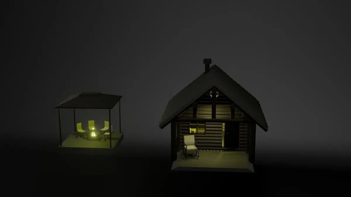 - Vertices 11.216-Edges 21,562-Faces 10.4832.House-Vertices 15.861-Edges 26.844-Faces 12.223All surroundings in the last photo are not included in the price (But the rocking chair is included in the price)This can be completely ready for implementation in games, movies or clips. All parts are made of materials without the use of textures. The render is made in the Eevee format. All parts are sorted and moved.