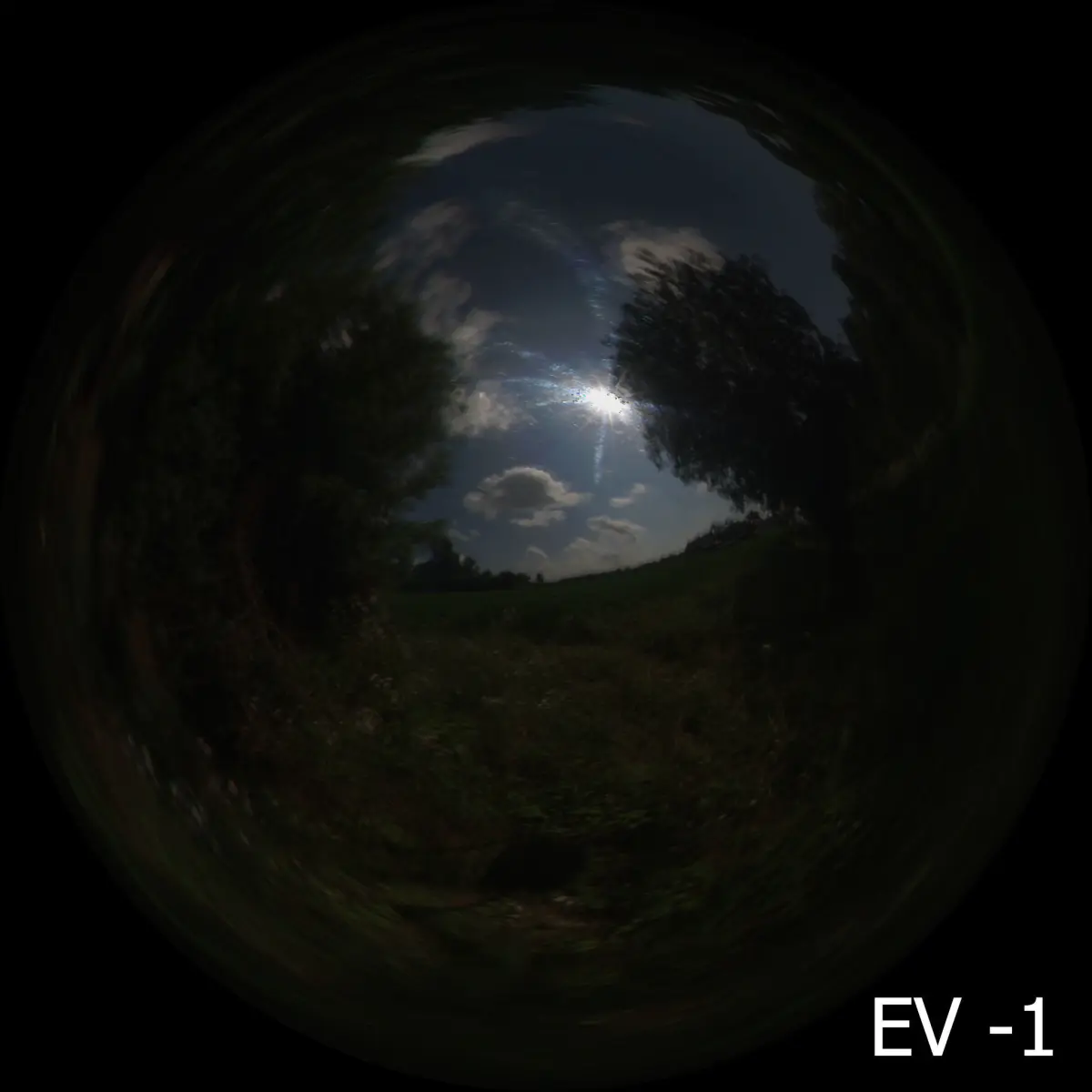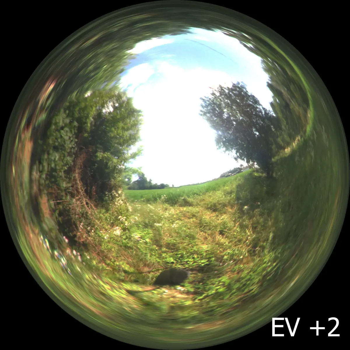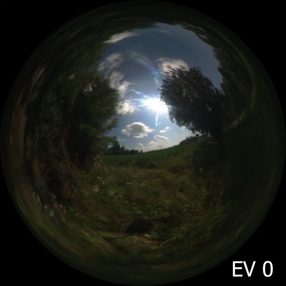 This light probe high dynamic range image (2048 x 2048) assembled from two radiance images of a mirrored ball. Each radiance image was assembled from nine exposures, one stop apart.