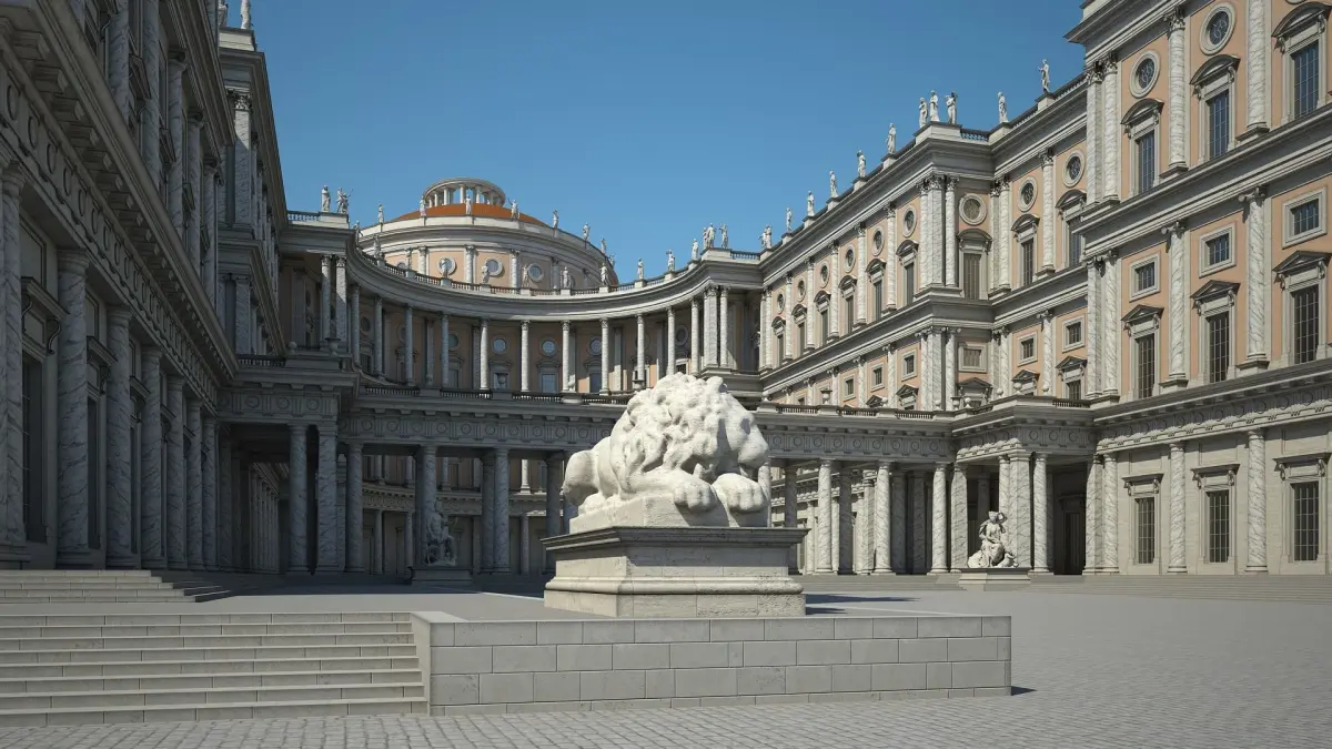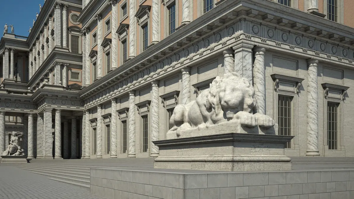 Highly detailed 3D model of a Palace Courtyard with an interior scene.