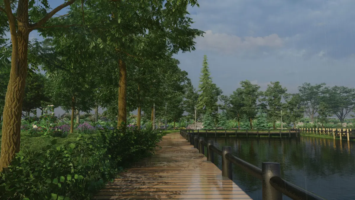 This scene is relatively lightweight, and the operation and rendering are faster. Consider It is a small local scene, so the whole terrain uses Lumion's 3D Grass, and in the final rendering, the water surface is picked up and the reflection effect is added.