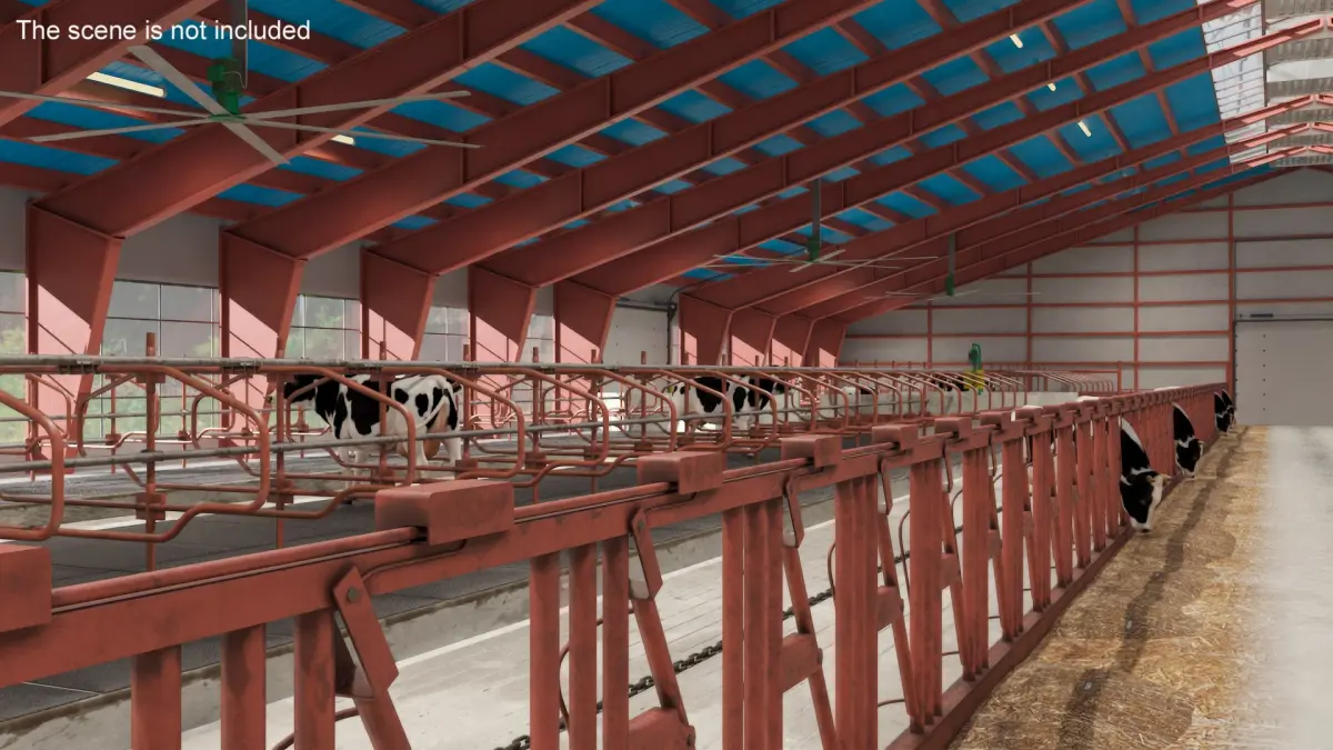 Cow Farm and Cows Fur is a three-dimensional model of interior of large industrial farm cattle shed that is a cow farm structure, showcasing a functional design with a row of cow stalls for efficient livestock management.