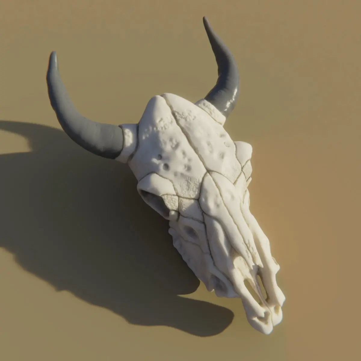 A sculpted Cow Skull, decimated for easier handling. It is not completely symmetrical, nor is the texturing.The skull is not anatomically correct, so please don't use it as reference for your pet cow's brain surgeory.