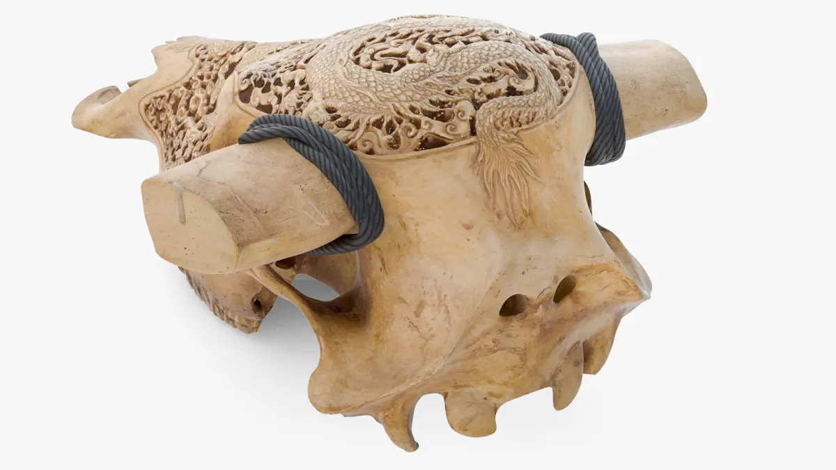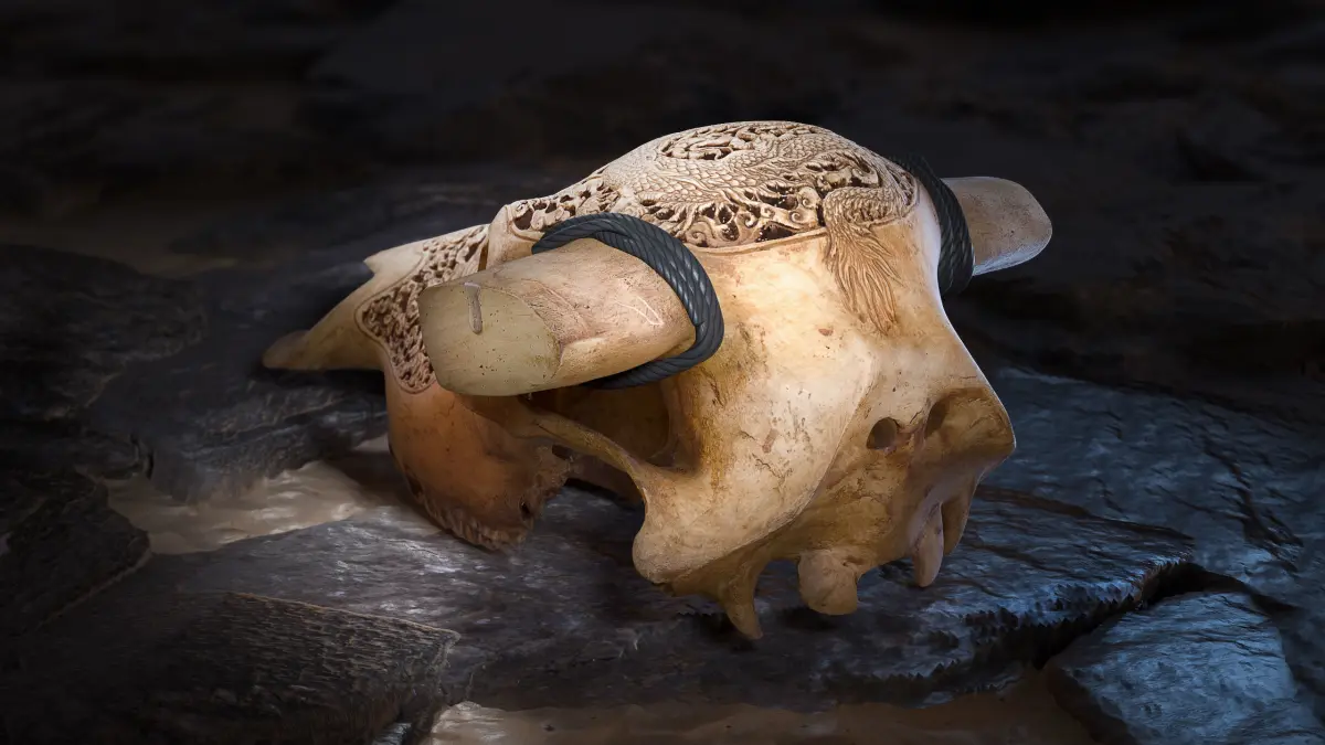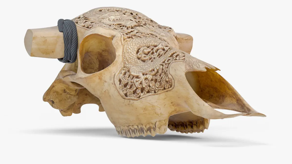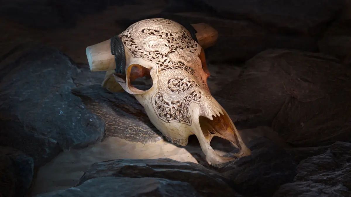 Cow Skull with Dragon Carved art - It is a realistic 3D model, it was made with photoscan technology and then cleaned, delighted and retoped.The model has separate pieces with their own non-overlapping UV: Cow Skull, Ropes.
