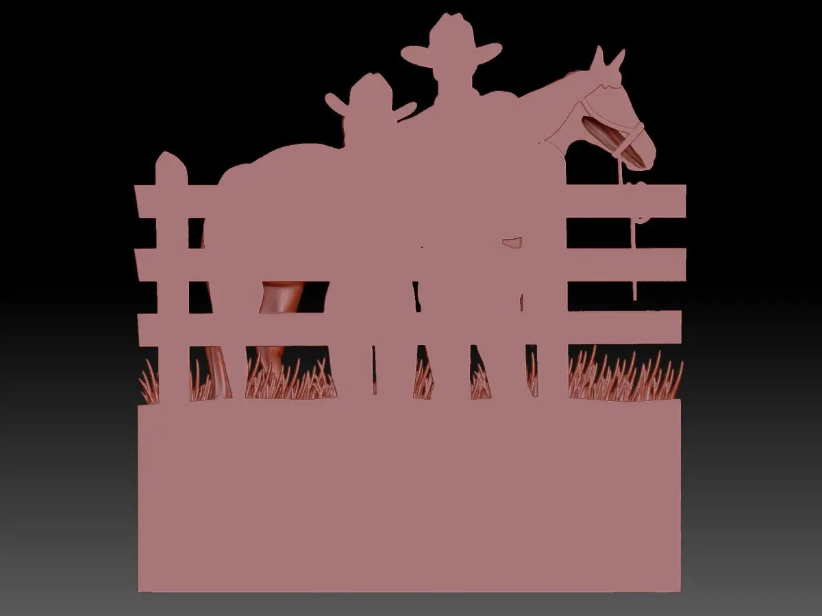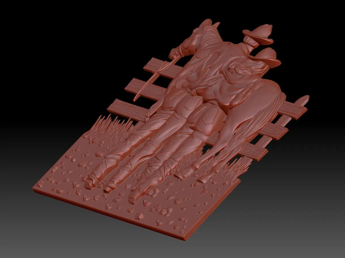 Cowboys is a 3D bas—relief model that captivates with its beauty and romance. It depicts a man and a woman standing with their arms around each other, their backs to the viewer, looking at a horse. This elegant and memorable image will look great both in 3D printing and in working with a CNC machine.