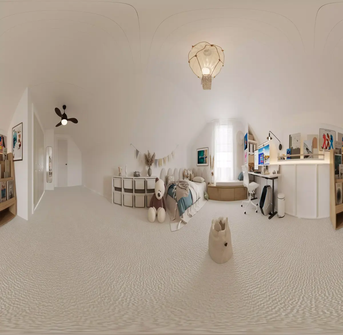 Cozy and Bright Attic Kids' Bedroom Interior with Study Nook - Detailed 3D ModelBring a touch of whimsical charm and bright, functional design to your visualizations with this highly detailed 3D model of a modern, Scandinavian-style attic kids' bedroom. Perfect for architectural visualization, interior design portfolios, or game environments, this model captures a warm and inviting atmosphere.Key Features:Detailed Interior Design: The model showcases a sloped attic ceiling, bright white walls and ceiling (shiplap texture on the ceiling), and a plush, light-colored carpet creating a spacious, airy feel.Themed Decor: Features a unique hot air balloon-style pendant light as the central fixture, complemented by natural wood accents, a whimsical scalloped headboard, and soft, stuffed animal décor (like the large teddy bear).Functional Zones:Sleeping Area: Includes a comfortable single bed with layered bedding in white, blue, and teal.Study/Workstation: A dedicated desk area with a computer setup, ergonomic chair, desk lamp, and various accessories, perfect for homework or creative projects.Reading Nook/Window Seat: A built-in wooden bench under the window provides a cozy spot for reading or lounging, complete with natural light and sheer curtains.Storage & Display: Integrated low white storage units, a modular wooden bookshelf for displaying books and artwork, and a subtle clothing closet/storage area.Ready for Rendering: The scene is fully textured and features realistic materials, including soft textiles, natural wood grain, and high-quality lighting (including natural daylight from the window and ambient ceiling light).High-Quality Assets: Includes numerous props and decorative elements to ensure a photorealistic result, such as framed posters, toys, storage baskets, a ceiling fan, and a full-length mirror.Ideal For:Architectural Visualization (ArchViz)Interior Design RendersResidential Property MarketingGame Development (Environment Asset)Virtual Reality (VR) Experiences