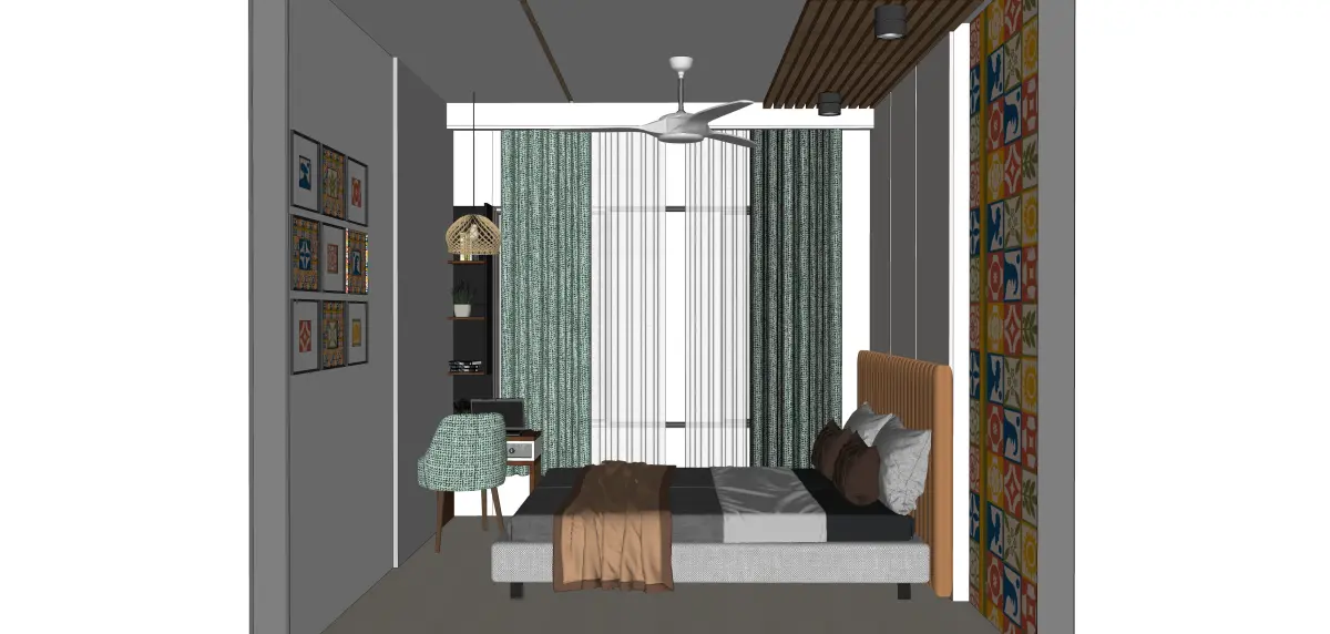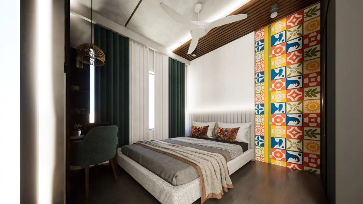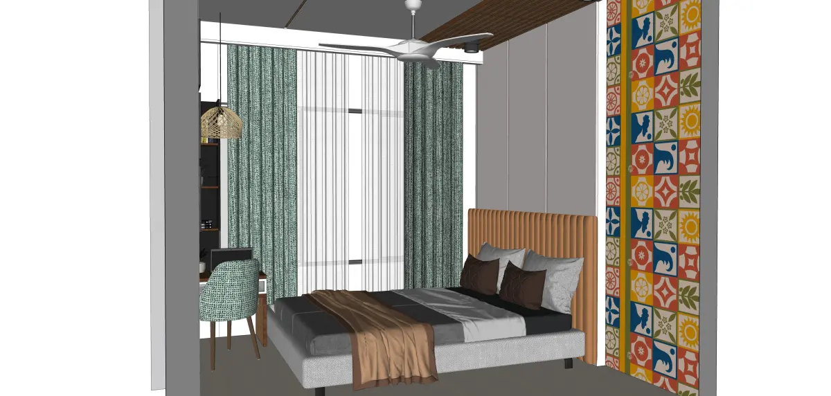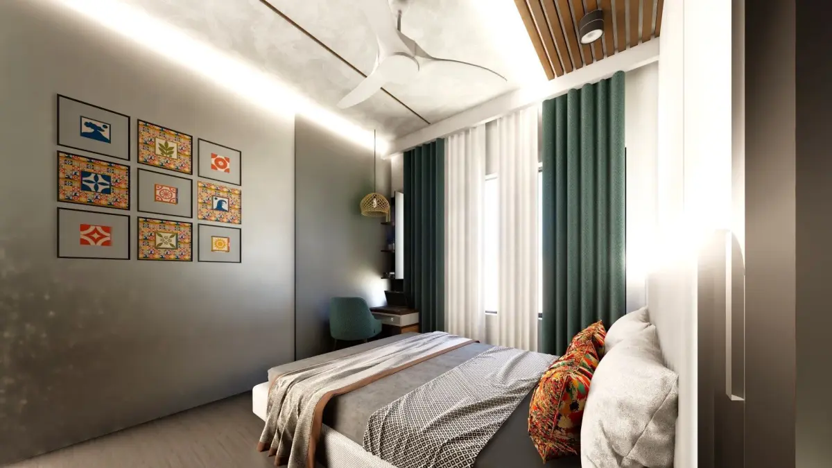 This beautifully designed bedroom interior combines the warmth of traditional Indian aesthetics with modern functionality. Featuring a cozy study corner, sleek wardrobe, and bright color palette, the space is adorned with unique Indian-patterned textures, creating a perfect blend of cultural charm and contemporary design. Ideal for architectural visualization and interior design projects, this scene is optimized for real-time rendering.