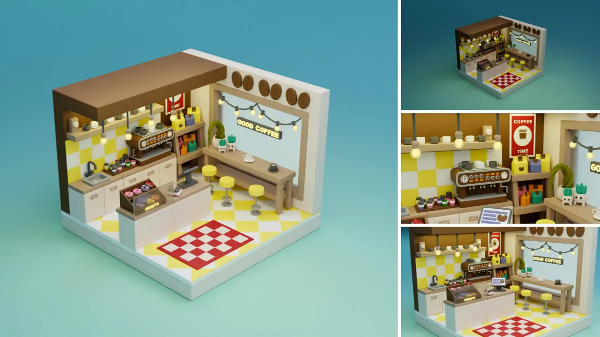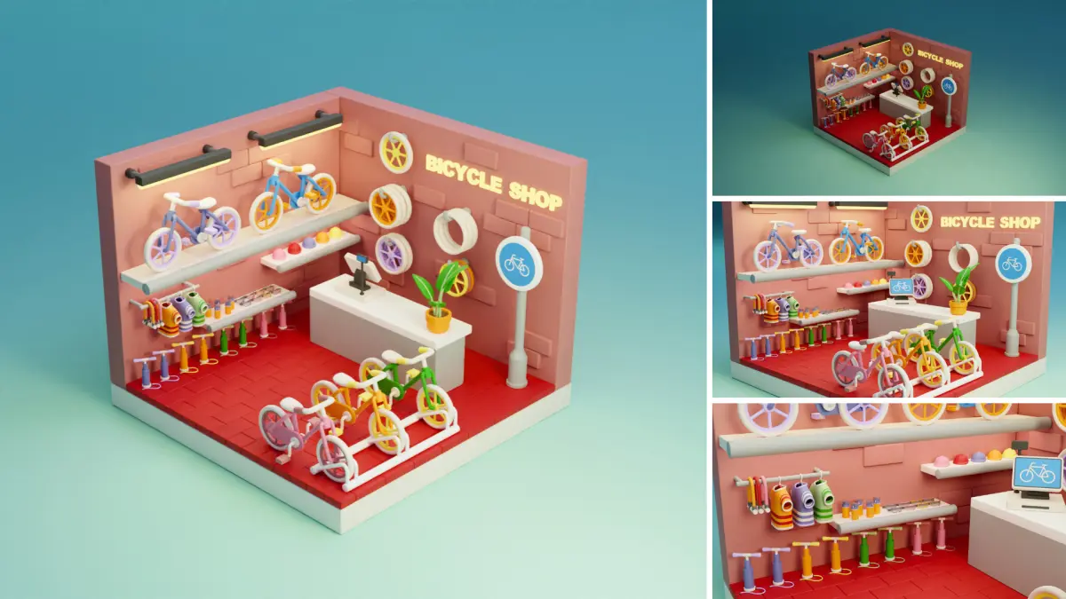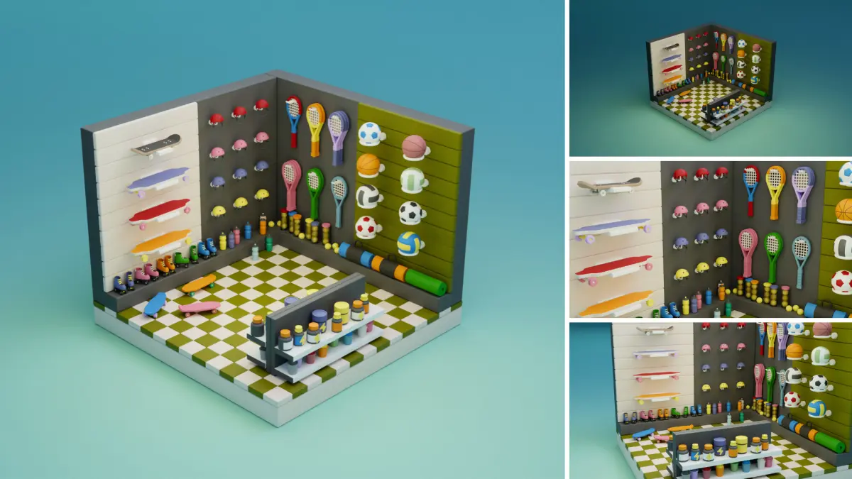 Interior props: car, bicycles, walls, windows, floors, cabinets, couches, tables, chairs, armchairs, plants, flowers, signs, stands, arcade machines, plates, paintings, bottles, food, sweets, dishes, bags, carpets, shelfs, books, decorations, blinds, sport equipment, electrical equipment, interior appliances and much more! The pack allows you to build any interior to your liking!