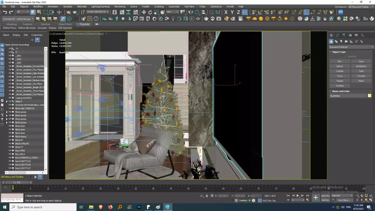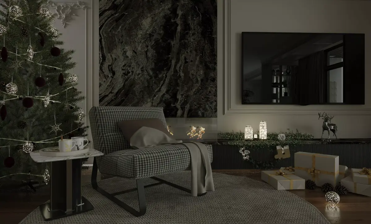 Cozy Christmas Living Room Scene 3D ModelCreate heartwarming and festive visualizations with this detailed 3D model of a cozy living room decorated for Christmas. This scene captures the warmth and joy of the holiday season, making it perfect for Christmas-themed renders, virtual staging, and holiday promotions.Scene DetailsFestive Christmas Tree: A beautifully decorated Christmas tree stands prominently in the scene, adorned with classic red ornaments, delicate silver accents, and sparkling lights, casting a warm holiday glow.Cozy Fireplace Ambiance: A modern fireplace with a dark, textured surround creates a focal point, with realistic flickering flames adding a touch of warmth and holiday cheer. Christmas greenery and subtle lighting enhance the mantelpiece.Comfortable Seating Area: A stylish armchair with a patterned upholstery is positioned near the fireplace, inviting relaxation. A small side table holds festive mugs and treats, suggesting a cozy holiday moment.Christmas Decorations: The room is subtly yet tastefully decorated with Christmas elements, including wrapped gifts with elegant ribbons, decorative lanterns, and a reindeer figurine, creating a festive atmosphere without being overwhelming.Soft Lighting: The scene is lit with a combination of natural light (if implied) and soft artificial lighting from the fireplace and decorative elements, enhancing the cozy and inviting mood.Neutral and Festive Palette: The color scheme combines neutral tones with traditional Christmas colors like red and green, creating a sophisticated yet festive ambiance.This fully textured and ready-to-render 3D model is ideal for 3D artists, interior designers, and marketers looking to create evocative Christmas-themed visuals.