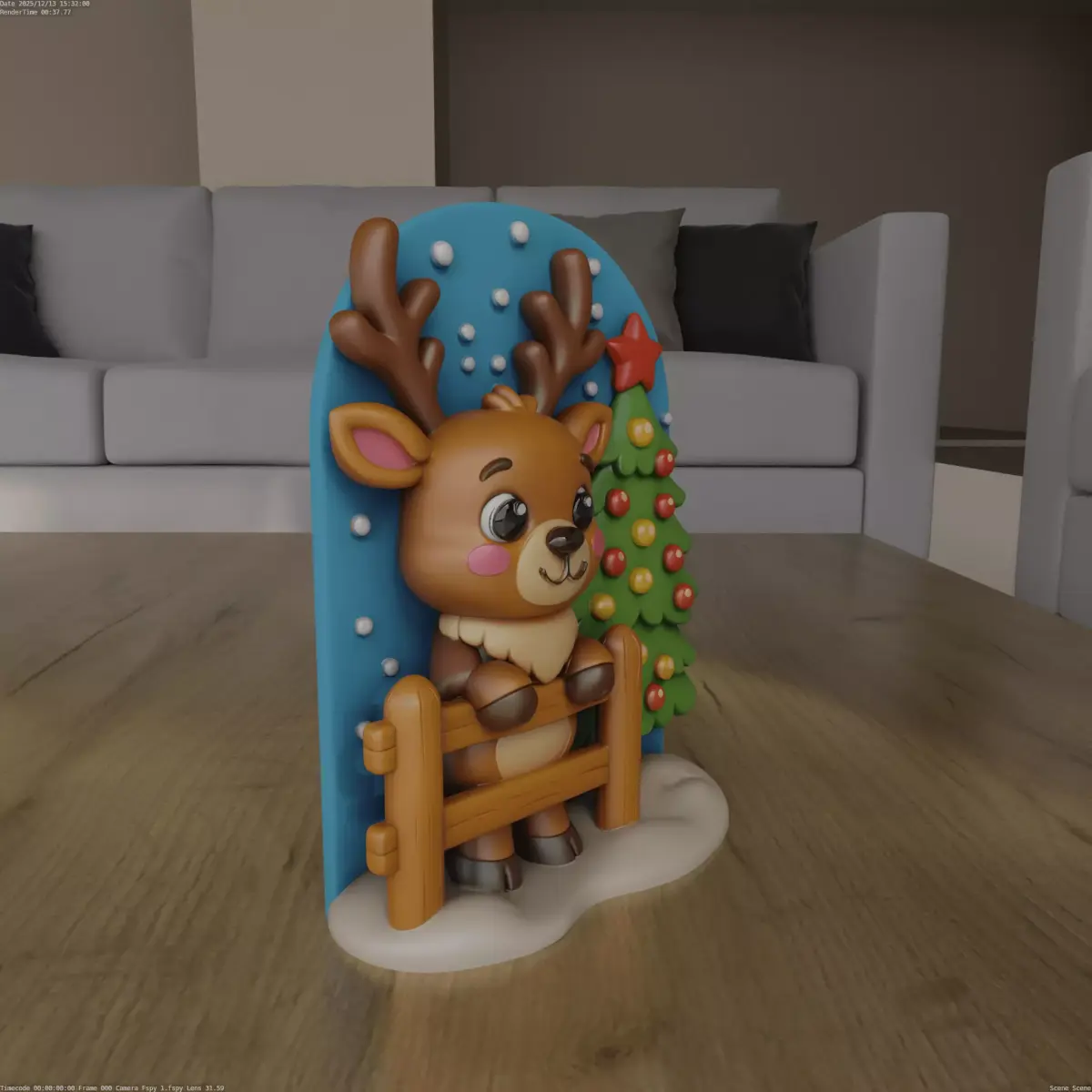 This cute reindeer decoration is perfect for your Christmas tree or holiday display. The friendly reindeer stands behind a wooden fence with a decorated Christmas tree beside it. This 3D printed decoration will bring holiday cheer to your home with its charming design and festive colors. It's the ideal addition to your Christmas decorations collection.