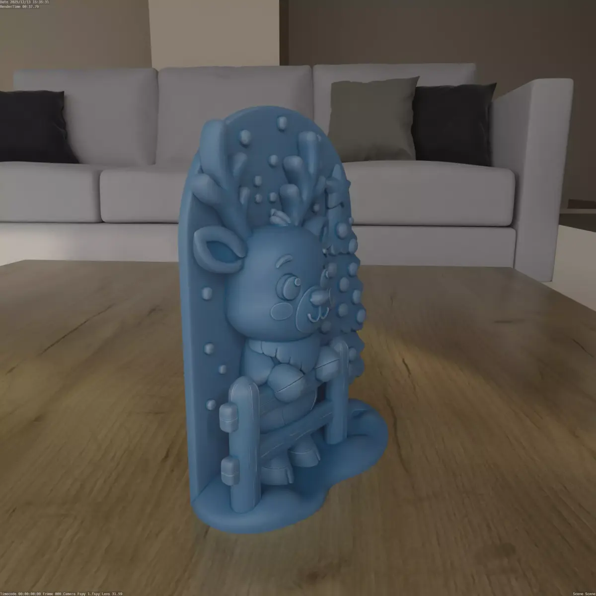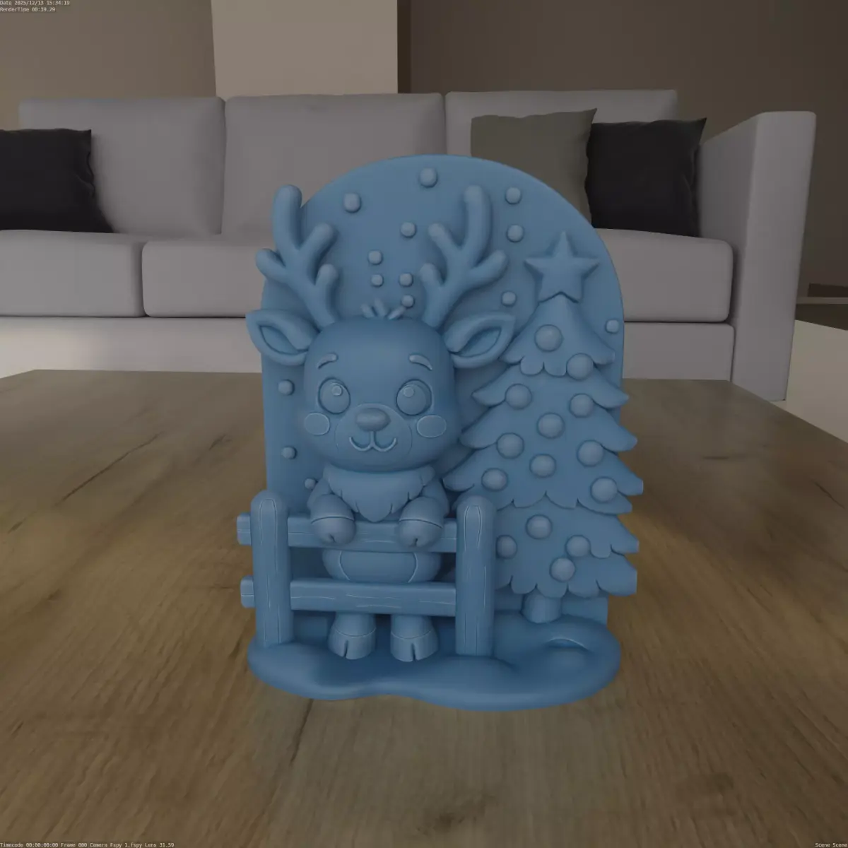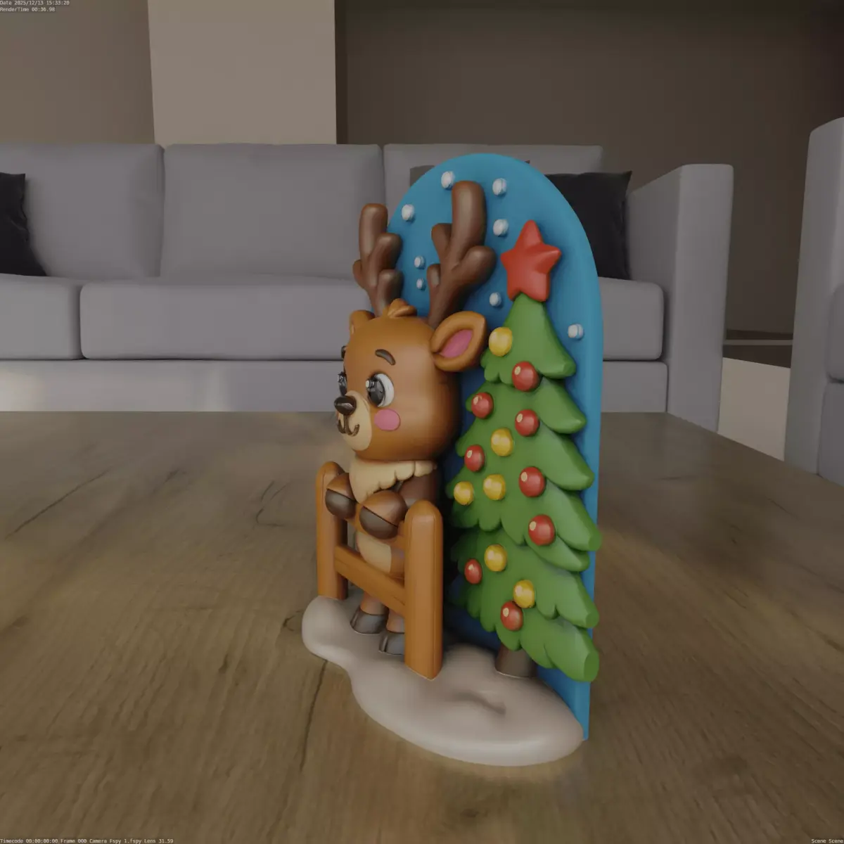 Design ConceptThe model brings a cozy and festive feel with an adorable reindeer and a decorated Christmas tree, perfect for holiday settings.