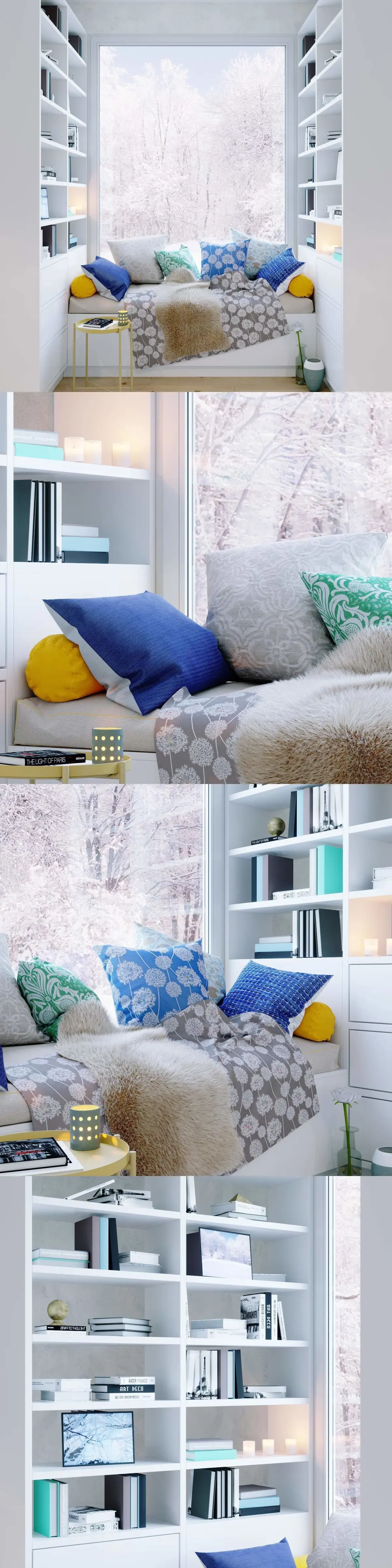 In the model you will also find pine parquet, books, flowers, candles, a GLADOM table from Ikea, and paintings which depict the Sabadur forest that I personally photographed. Against the backdrop of the window, this forest is also depicted.