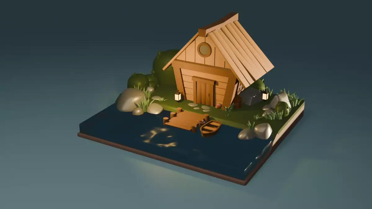 Handcrafted cozy low-poly lake house diorama made in Blender 5.0