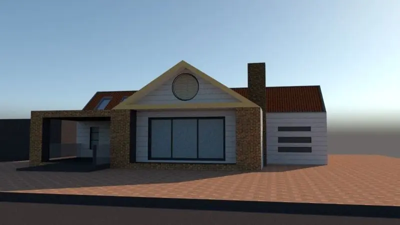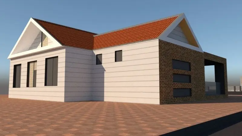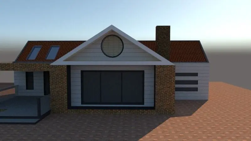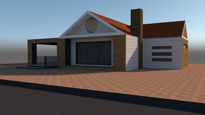 New project.3 hours worked.The perfect house for a village or town environment perfect for a family of 3 or 4 members, the house consists of the following: 3 rooms (2 bedrooms plus living room), a fireplace, a kitchen, 2 bathrooms, a garage and an attic where the 2 bedrooms will be located.Project made with the help of a 3D graphics program = Sketch Up and rendered with the help of V-Ray Software.