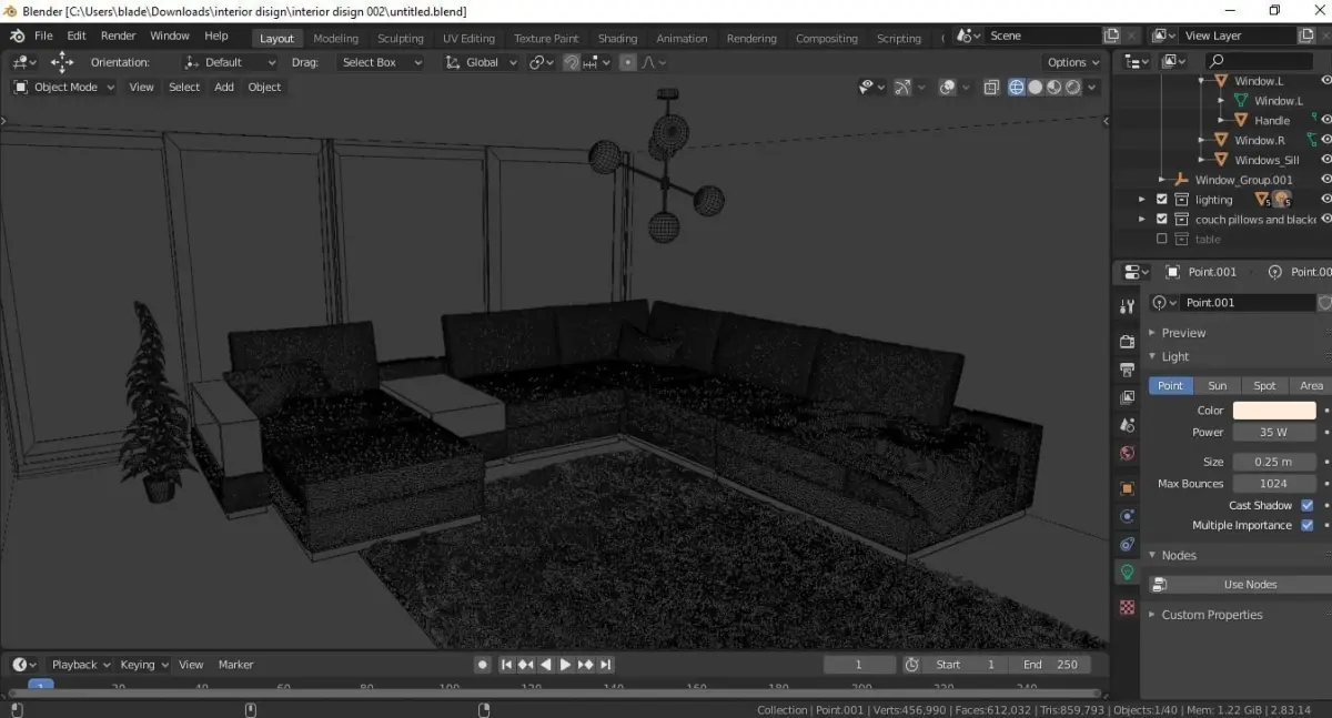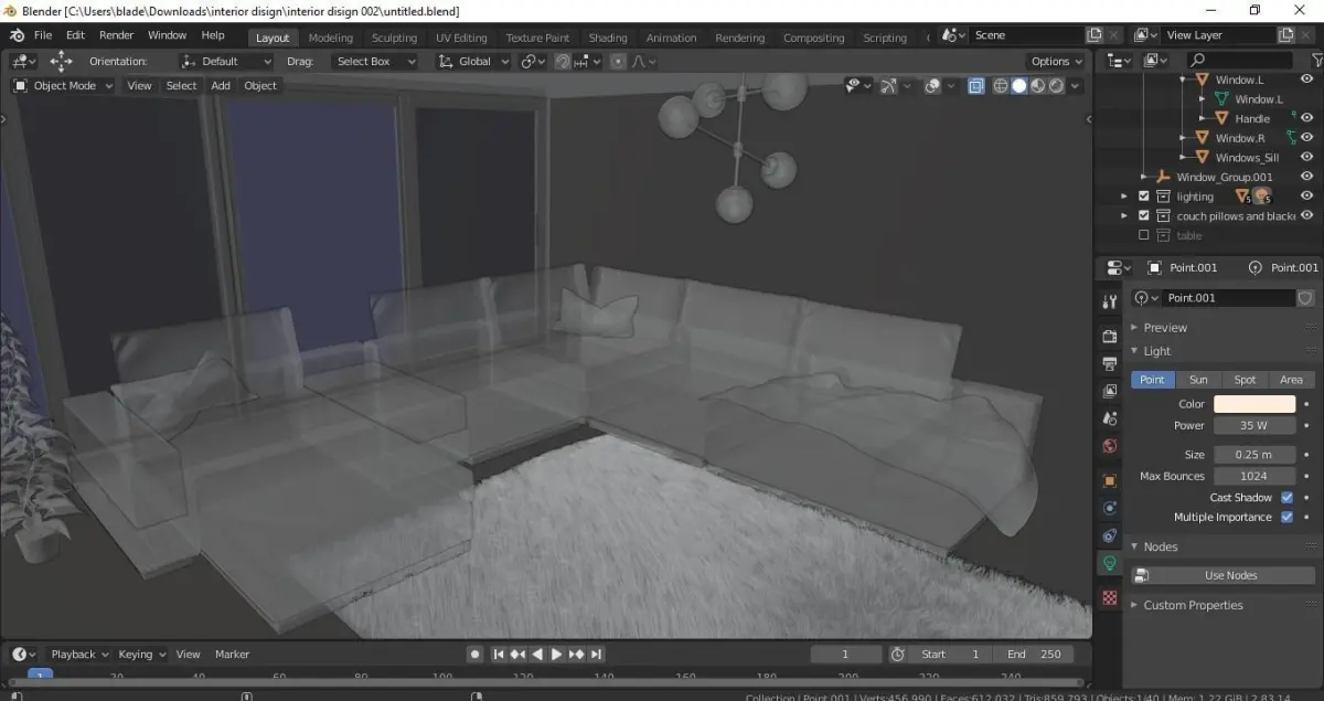 This is a simple yet slick design with realistic detail. This model inscludes, a couch, a coffe table, a fruit bowl, standing plant, pillows and blanket, tv and tv stand, a hanging light from the ceilling, and last a black rug on the ground. The background includes an hdri.