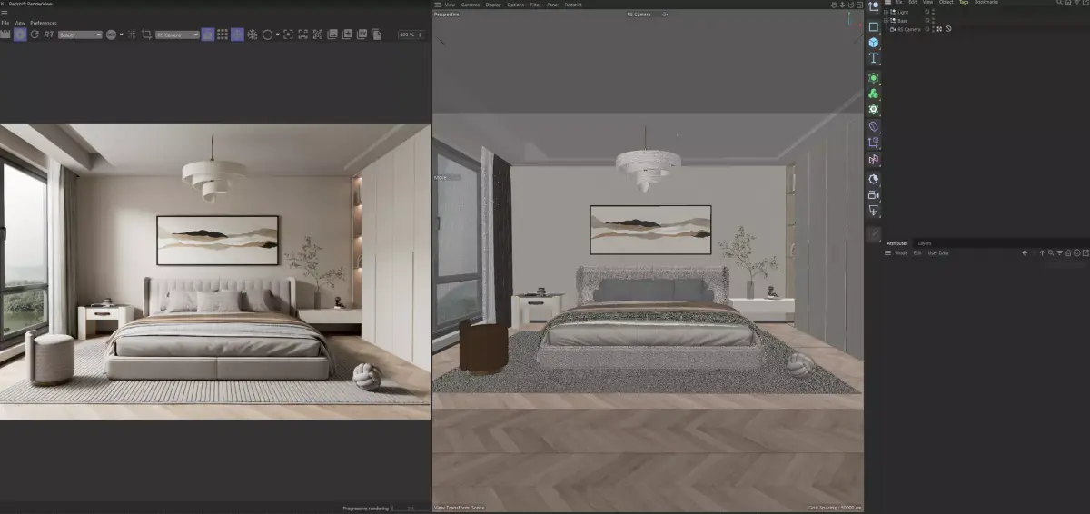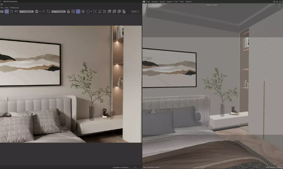 - Detailed models: premium upholstered bed, tiered fabric pendant light, and a minimalist built-in wardrobe with warm LED accents.