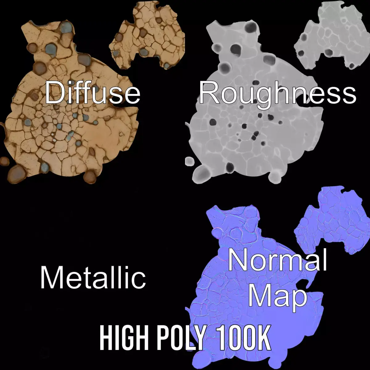 This cracked earth texture model pack features a realistic representation of dried soil with embedded stones, perfect for environments requiring natural and rugged textures. Each model has 3 levels of detail: low-poly (1000 triangles for mobile), middle-poly (10,000 triangles for environment), and high-poly (100,000 triangles), suitable for production rendering with 3ds Max, Maya, Cinema 4D, Blender, V-Ray, Corona, and Cycles and compatible with game engines like Unity and Unreal for interactive presentations, providing a choice of detail based on the LOD System principle. Ideal for use in video games, simulations, architectural visualizations, and film production. The model's textures include PBR, Diffuse, NormalMap, and reflection/roughness/metallic, making it suitable for any modern rendering engine. All models are accurately unwrapped with no overlapping UVs. Textures are provided at 4096x4096 resolution for high-quality detail. Please like and leave a comment if you enjoyed this model!