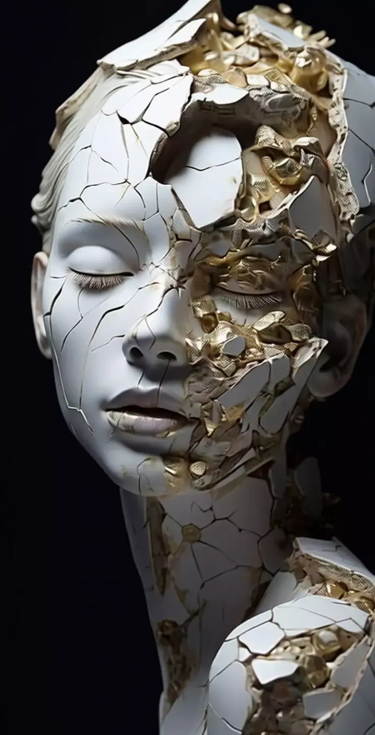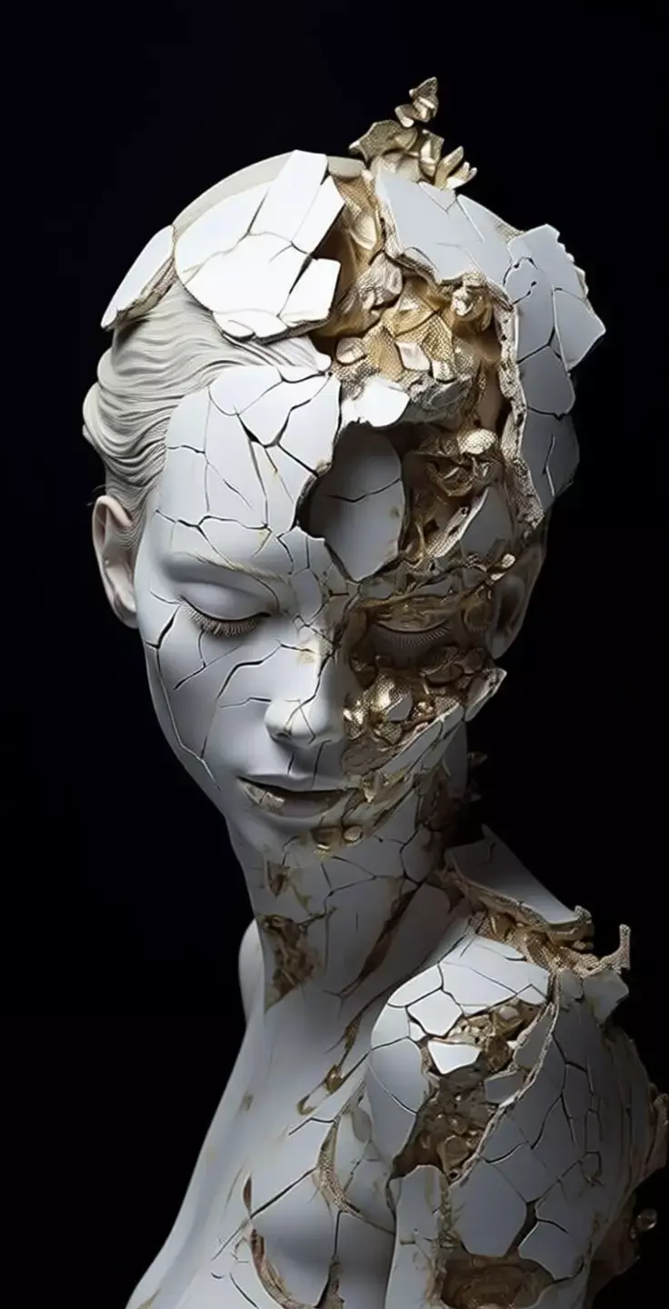 The surface of her face, neck, and shoulders is shattered into irregular pieces, each fracture filled with rich, reflective gold that highlights the breaks rather than hiding them. These golden veins create a striking visual contrast against the cool white stone, symbolizing resilience, healing, and beauty in brokenness. Some fragments are lifted slightly from the body, suggesting motion or disintegration, while others remain fused, forming a dynamic interplay between destruction and repair.