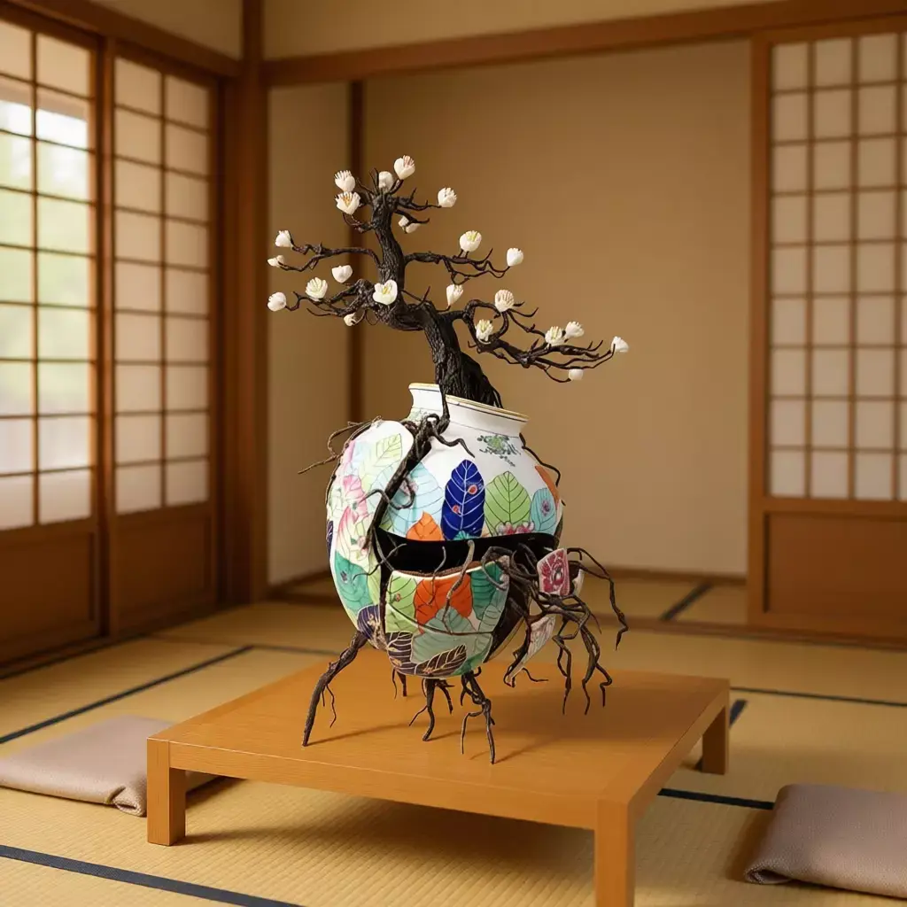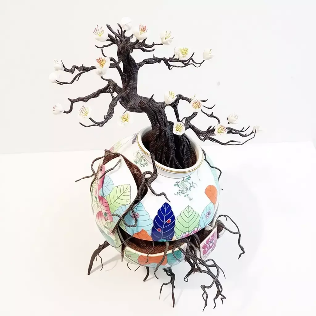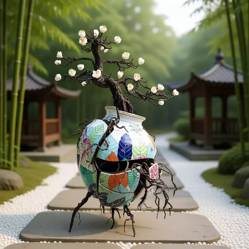 The sculpture stands as a contemporary art piece that merges traditional East Asian aesthetics—such as Japanese ikebana or Chinese porcelain art—with modern surrealist expression. It speaks to environmental awareness, emotional recovery, and the beauty found in imperfection—a concept closely aligned with wabi-sabi philosophy. Ideal for use in digital galleries, conceptual installations, interior design, or as a symbolic element in storytelling projects.