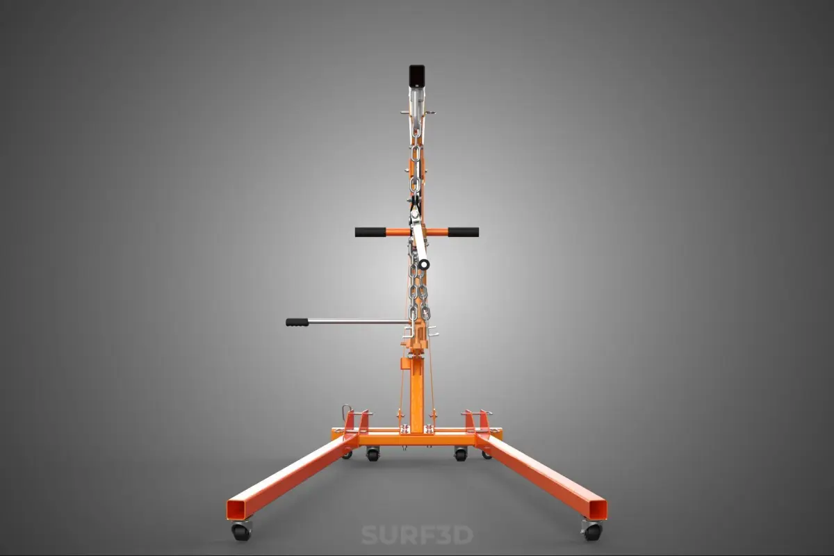 This integrated system is primarily designed to address the challenges associated with lifting and maneuvering heavy, often irregularly shaped objects such as internal combustion engines during removal, installation, or transportation processes. Engines are not only heavy but also have a complex center of gravity, which can shift as the engine is tilted or moved. Without precise control over the load's angle and balance, these operations can be difficult, hazardous, and potentially damaging to the engine or surrounding components.