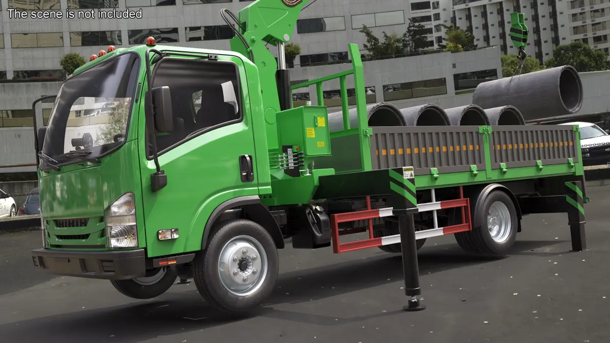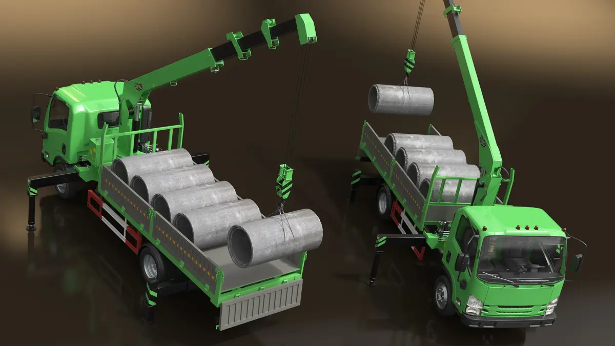 Crane Truck Manipulator with Concrete Pipes is a three-dimensional model cargo crane truck with crane manipulator, that is a specialized vehicle equipped with a truck-mounted crane for lifting and handling heavy loads.