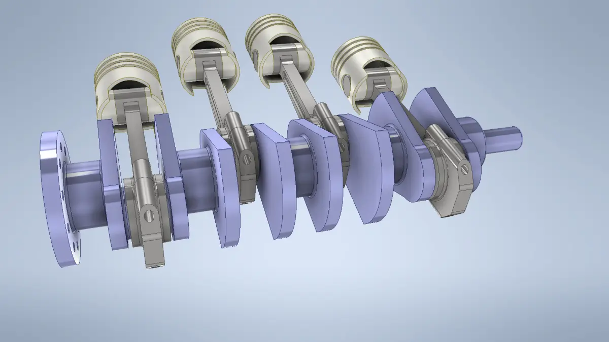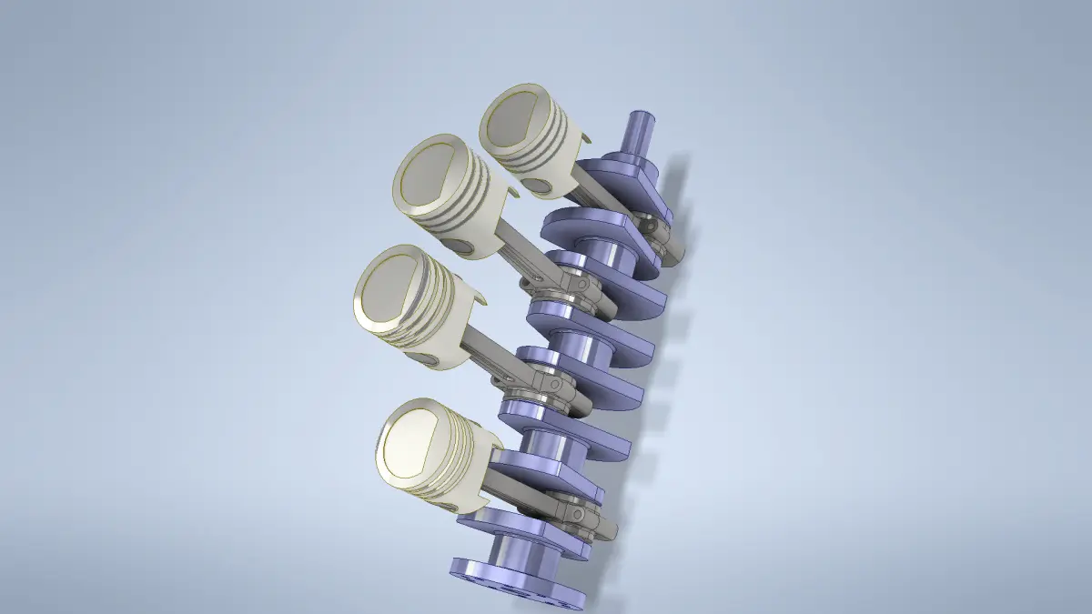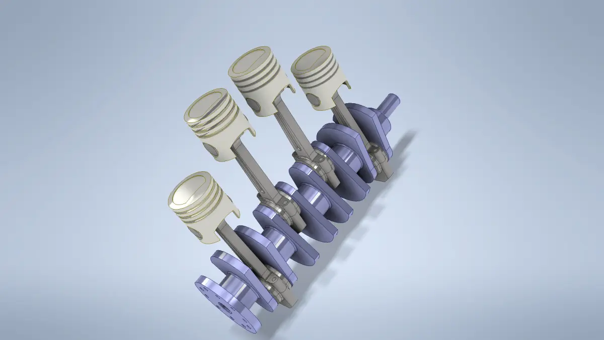 The image shows a 3D-rendered model of a four-cylinder internal combustion engine's crankshaft and piston assembly.This assembly is crucial in engine mechanics, ensuring smooth power delivery and mechanical efficiency