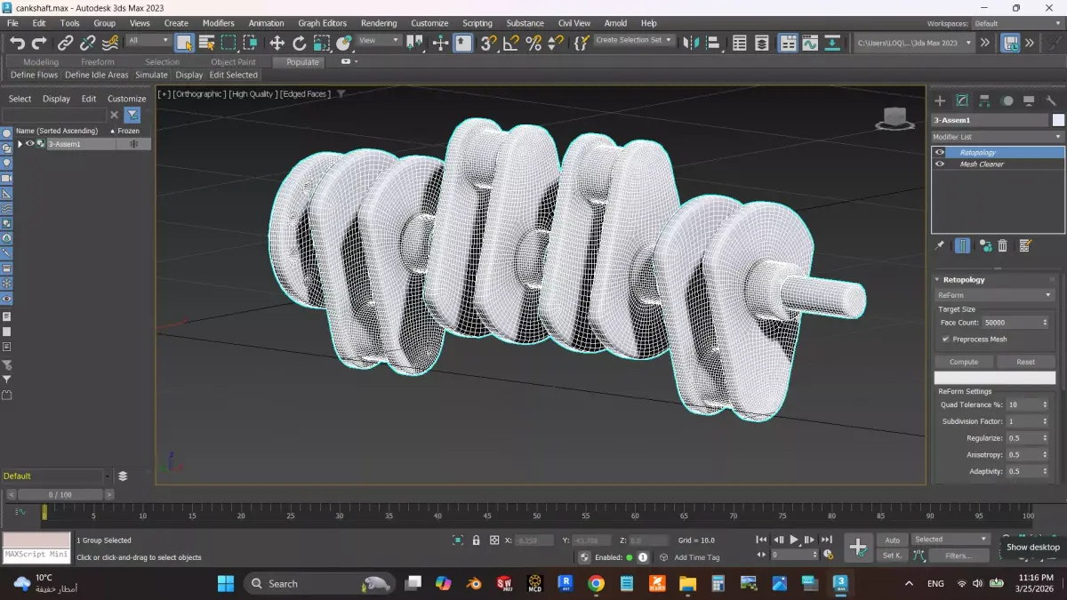 a crankshaft designed using solidworks 2023 available in many formates compatible with solidworks , blender ,3d max availble in stl format which make it possible for 3D printing . it is about 65 cm long , 15 cm height