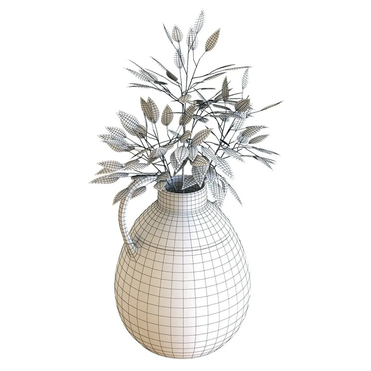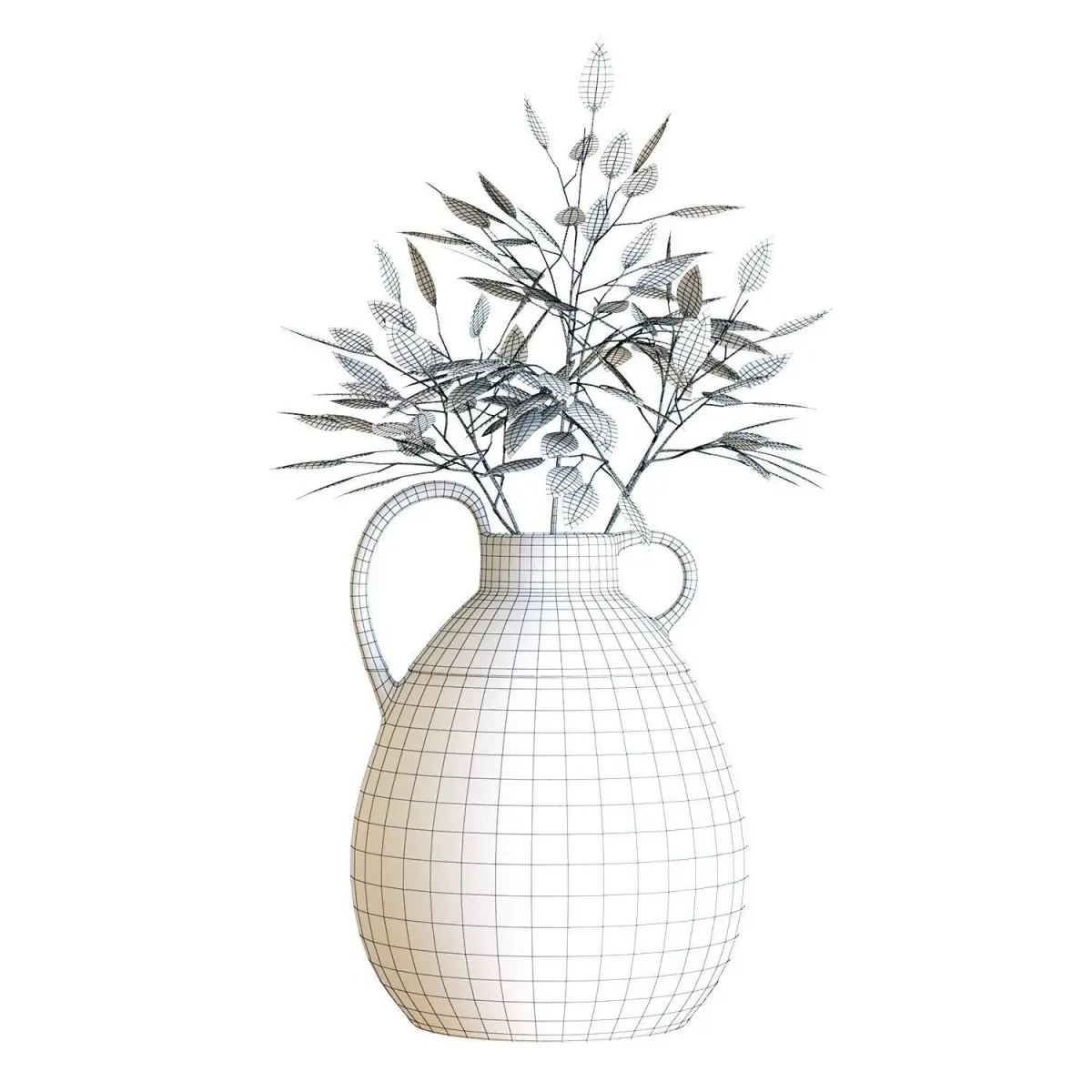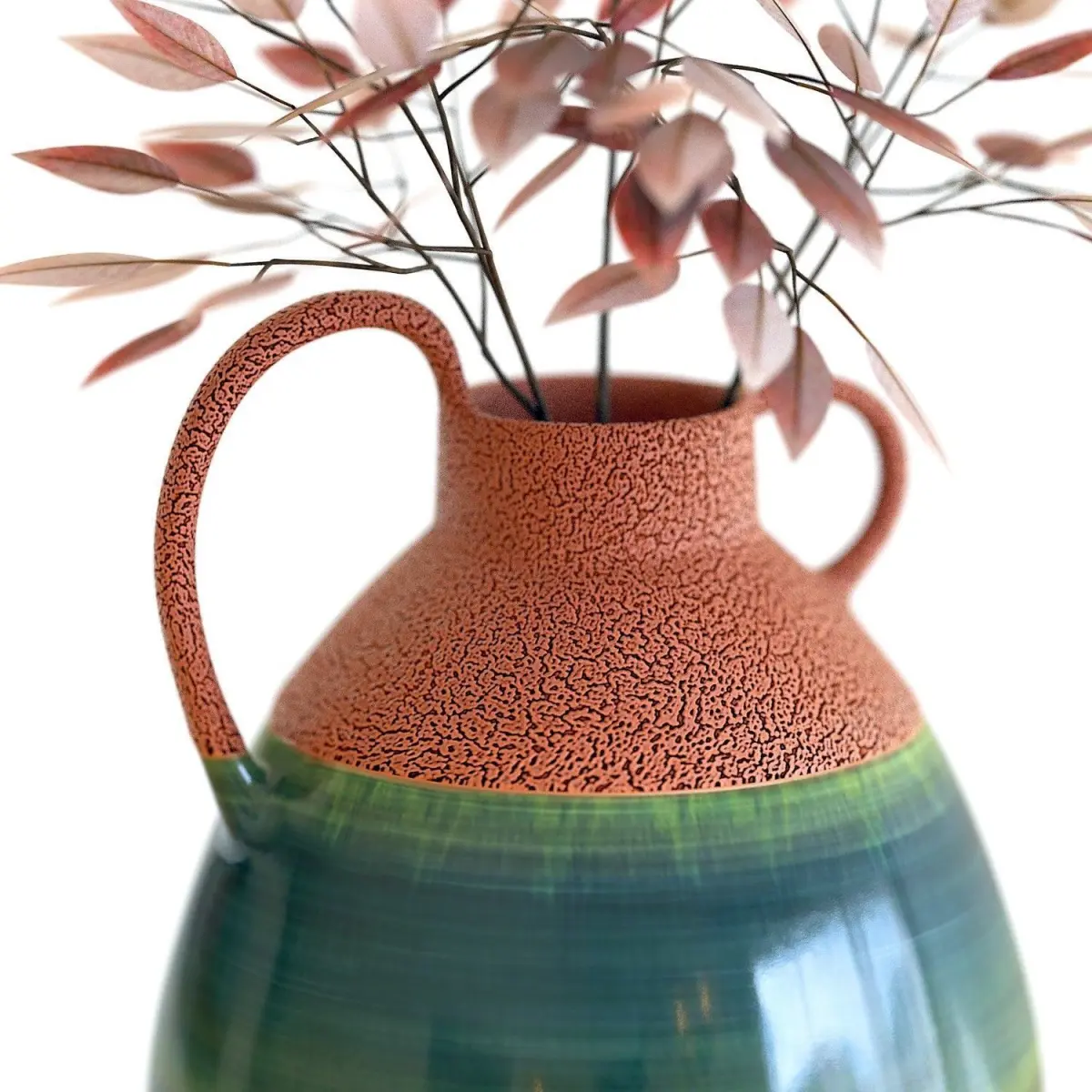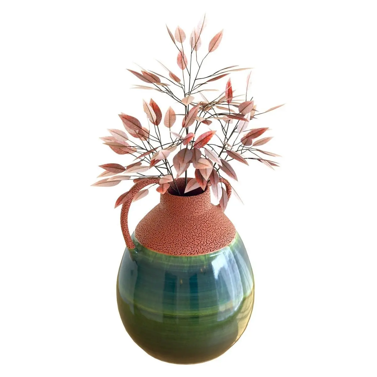 High-quality 3d model of a Crate and Barrel Ashland Rust and Teal Ceramic Vase with Handle with Fall Willow Eucalyptus Arrangement.