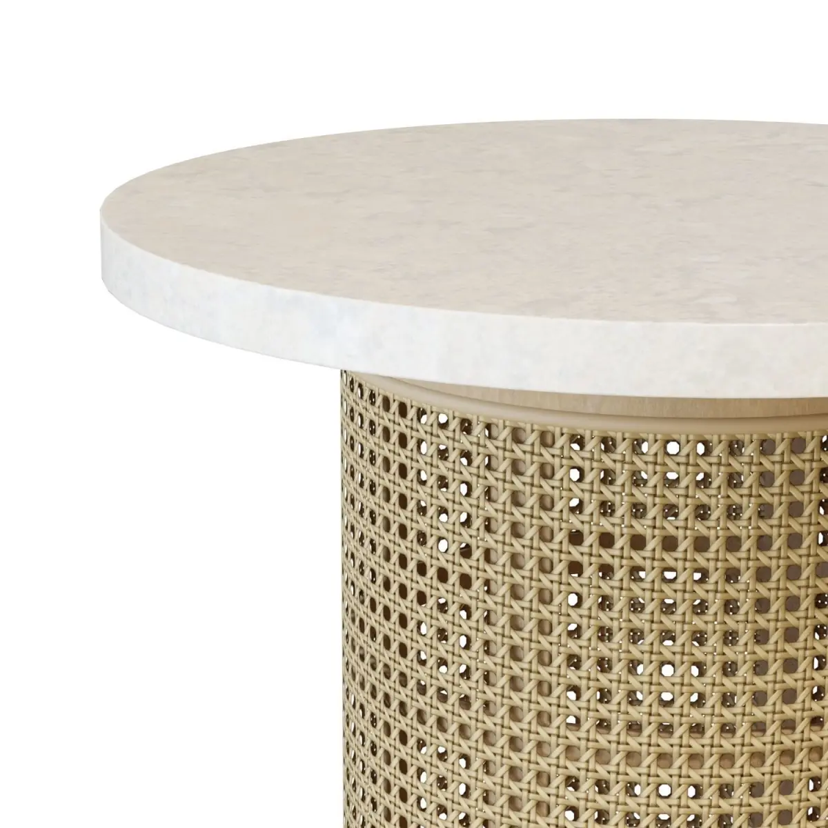 High-quality 3d model of the Crate and Barrel Vernet Travertine Cane Round End Table.