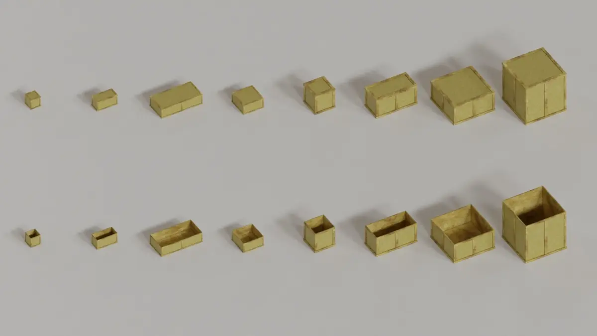This pack contains 72 game ready crates, comprised of four different styles across nine collections, optimized for use in a variety of gaming projects. Each collection is a set of eight crates that come in a variety of standard game metric sizes. Three PBR texture maps are used for the first two styles (shared by the first three collections), four PBR texture maps are used for the other two styles (two collections each), making the entire 72 crate pack textured by only 14 maps. Maps are all 2k in resolution, with the included .psd files with layers for easy adjusting or adding decals. Crates are all named with their appropriate style, collection and size to allow for ease of use.