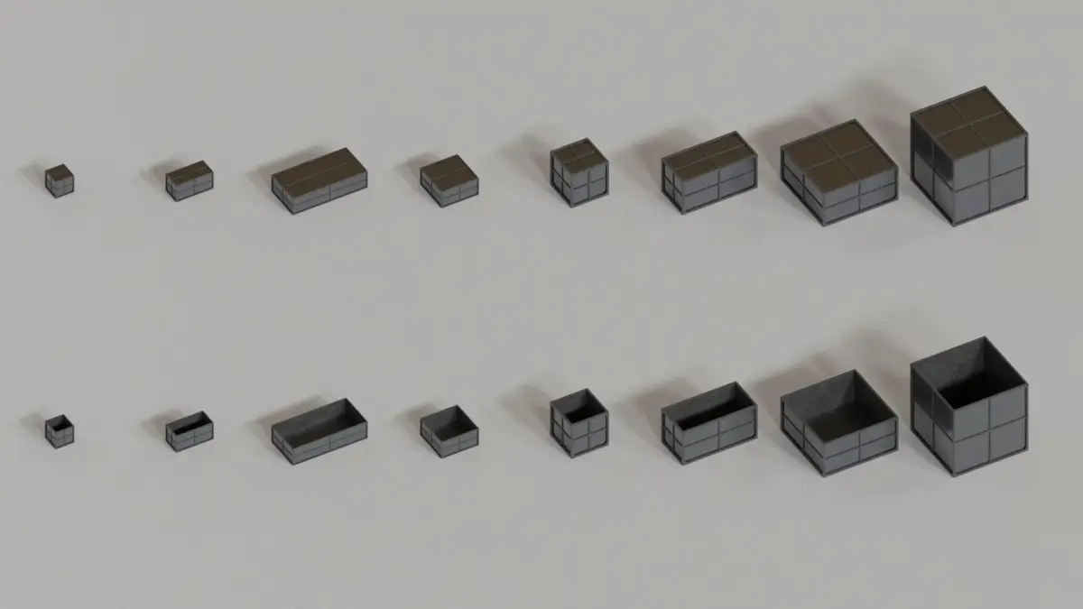 (width, depth, height)1m x 1m x 1m2m x 1m x 1m2m x 2m x 1m2m x 2m x 2m0.5m x 0.5m x 0.5m1m x 0.5m x 0.5m2m x 1m x 0.5m1m x 1m x 0.5m