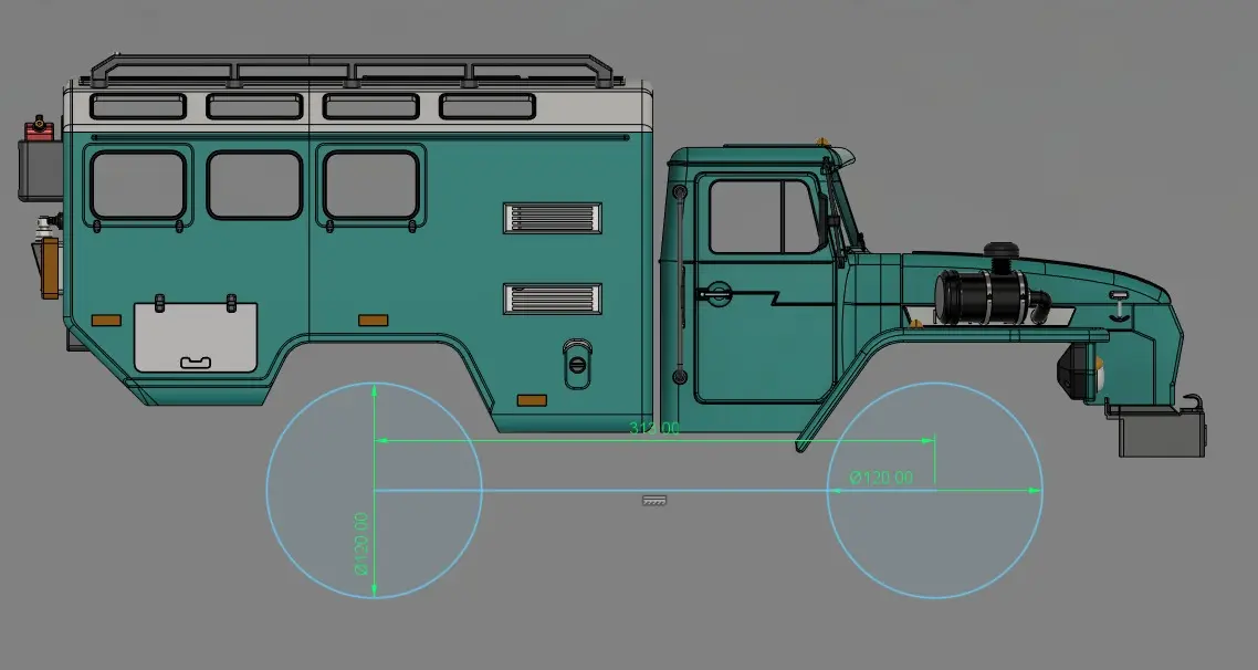 In order to use the 4320 single cab body with this DC Expedition Cab, a minimal wheelbase of 324mm is recommended. 313mm will make the front wheel very close to the fender when turning. However it will physically fit. Scale diagrams for those are also shown in the pictures. Please note that you will still need to design and use your own mounts when building this configuration.