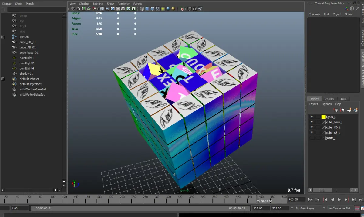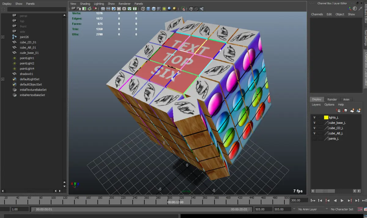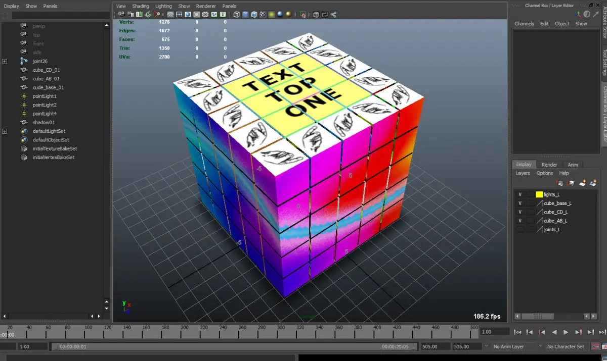 The cube has three objects, rigged but without controls.